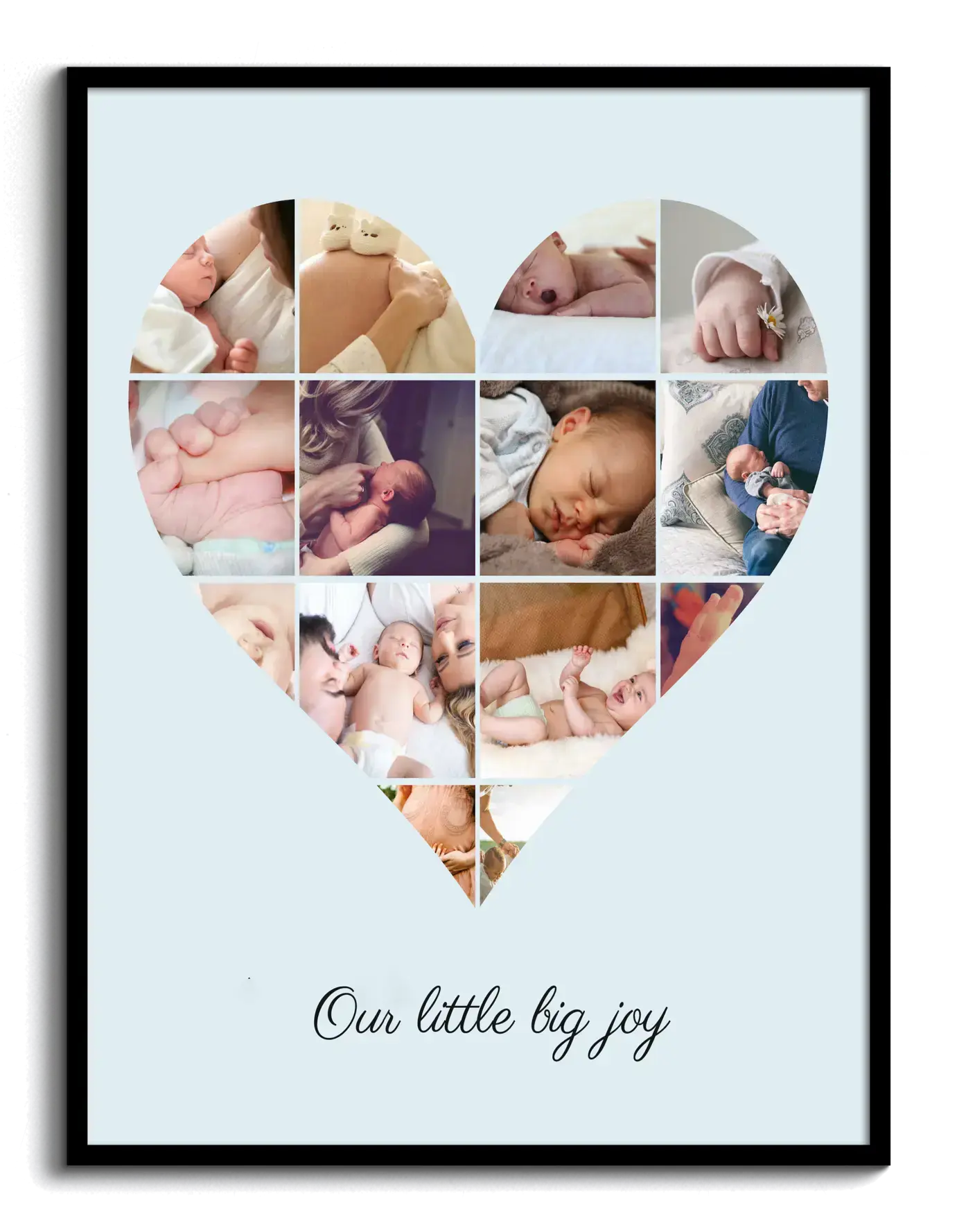 Create your own personalized photo collage to capture and celebrate life’s precious moments. Imagine a heart-shaped collage filled with baby or child photos, framing the beautiful phrase: "our little big joy". This collage can be uniquely tailored with your favorite photos and text, making it a perfect gift for births, baptisms, or as a cherished memento.