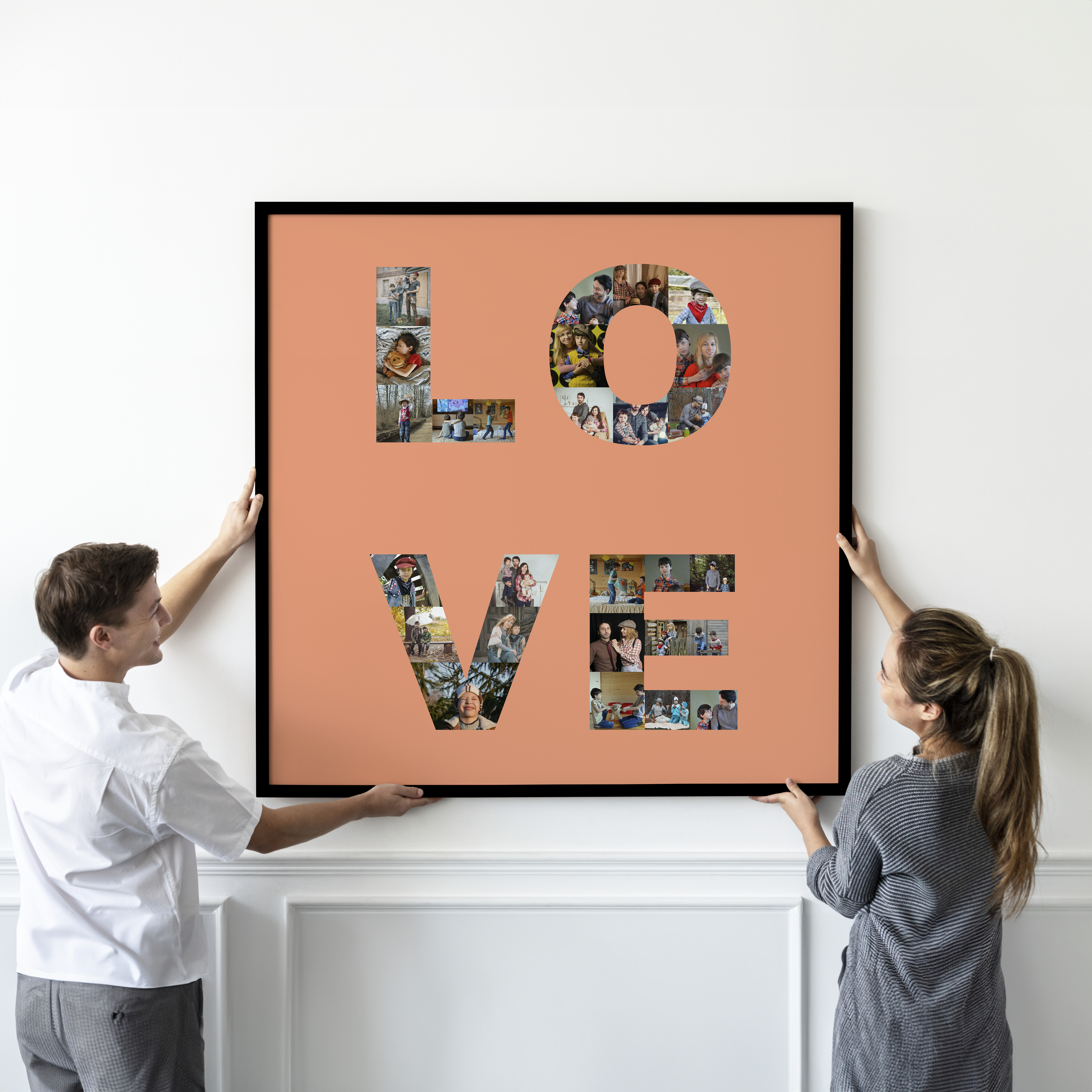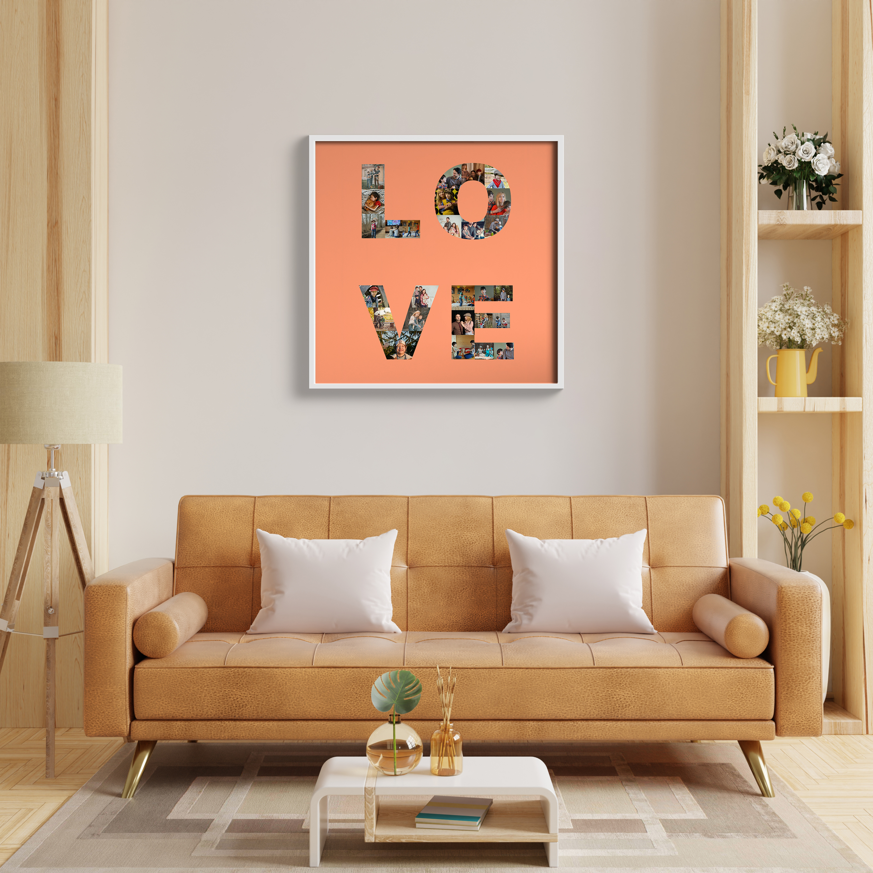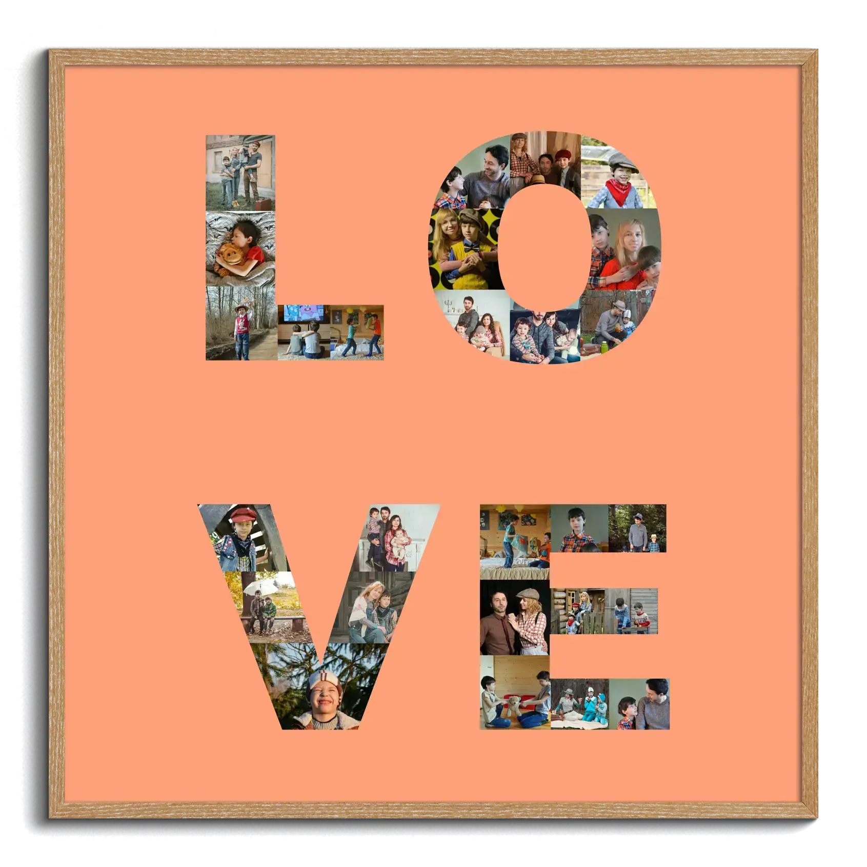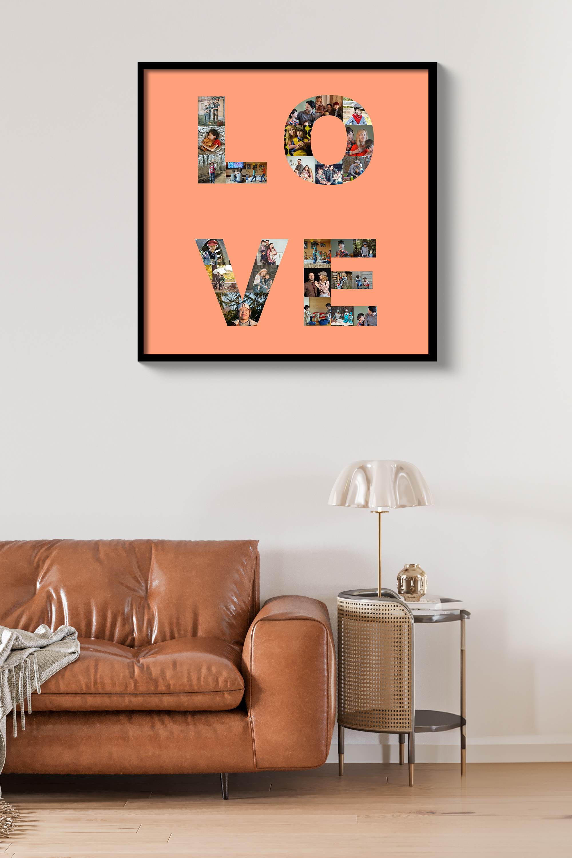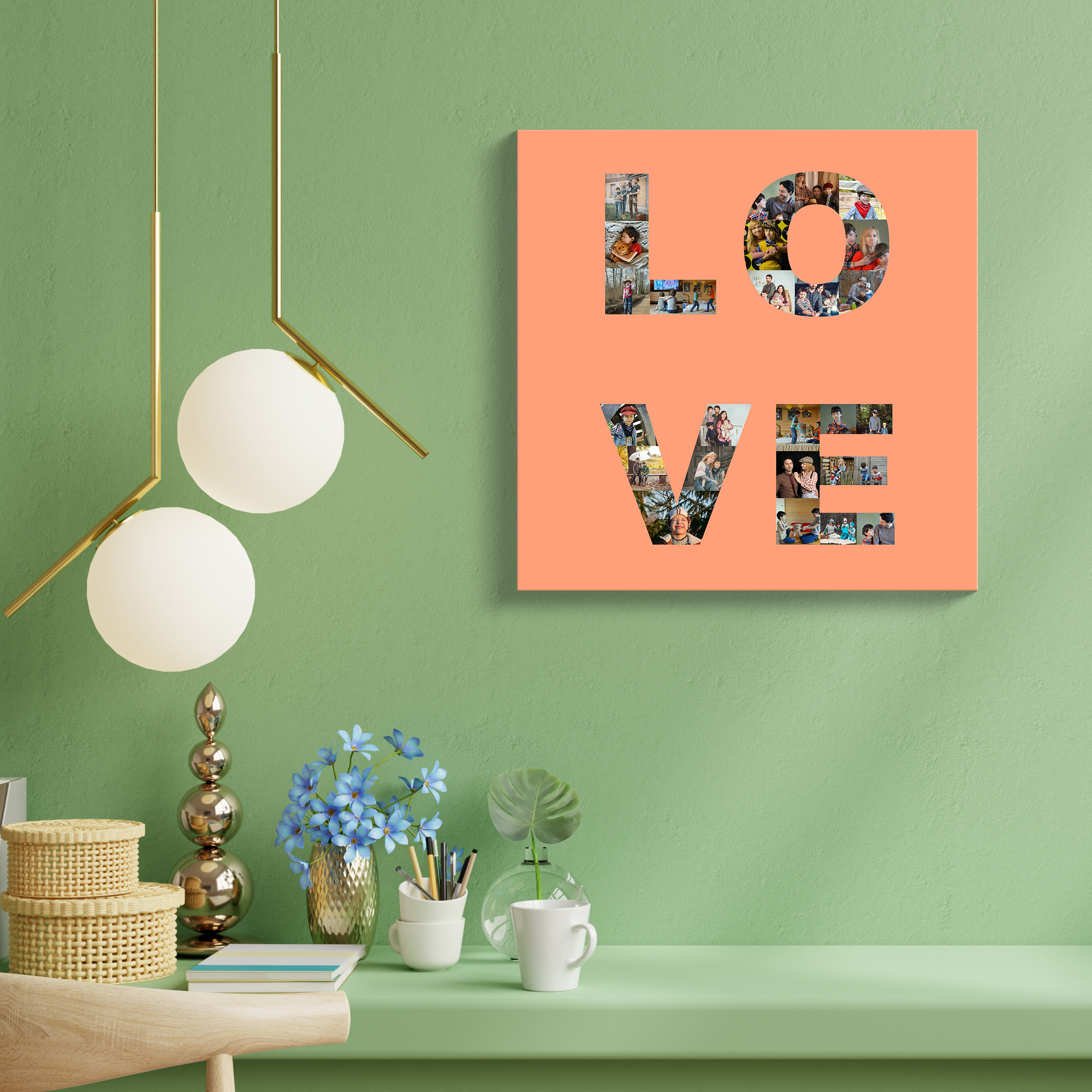 Create your own stunning photo collage with a personal touch! Imagine the word LOVE crafted from your unique photos, forming a vibrant and stylish collage over a striking orange background. This design is perfect for couples and families, celebrating themes of love and shared memories. It's an ideal gift for weddings, anniversaries, or Valentine's Day, or just to adorn your living space. The photos and background colors are fully customizable to suit your style.