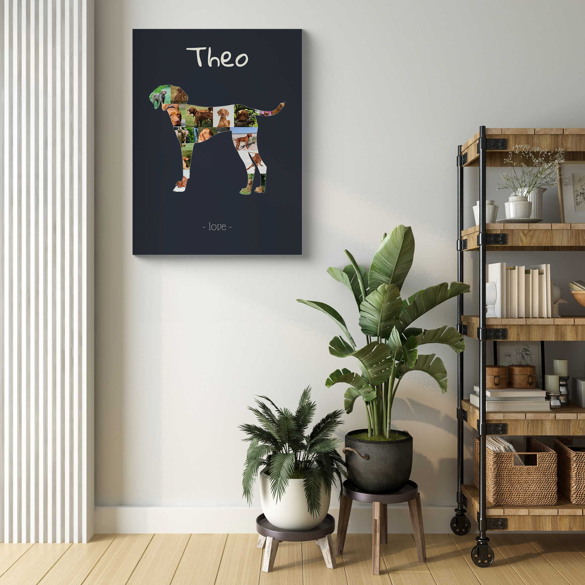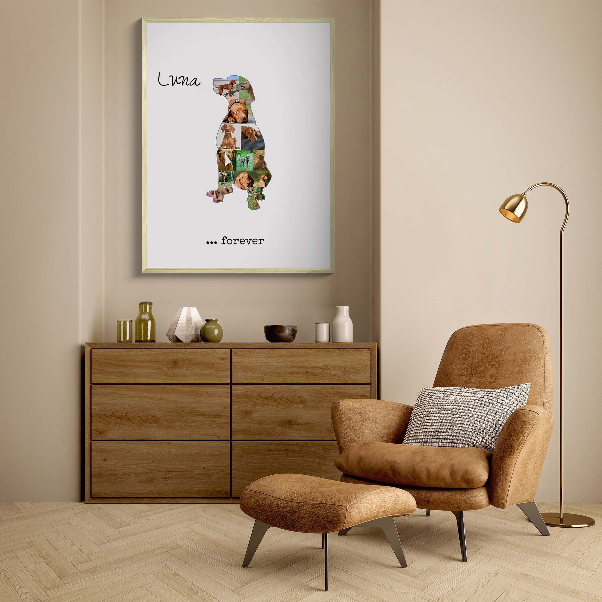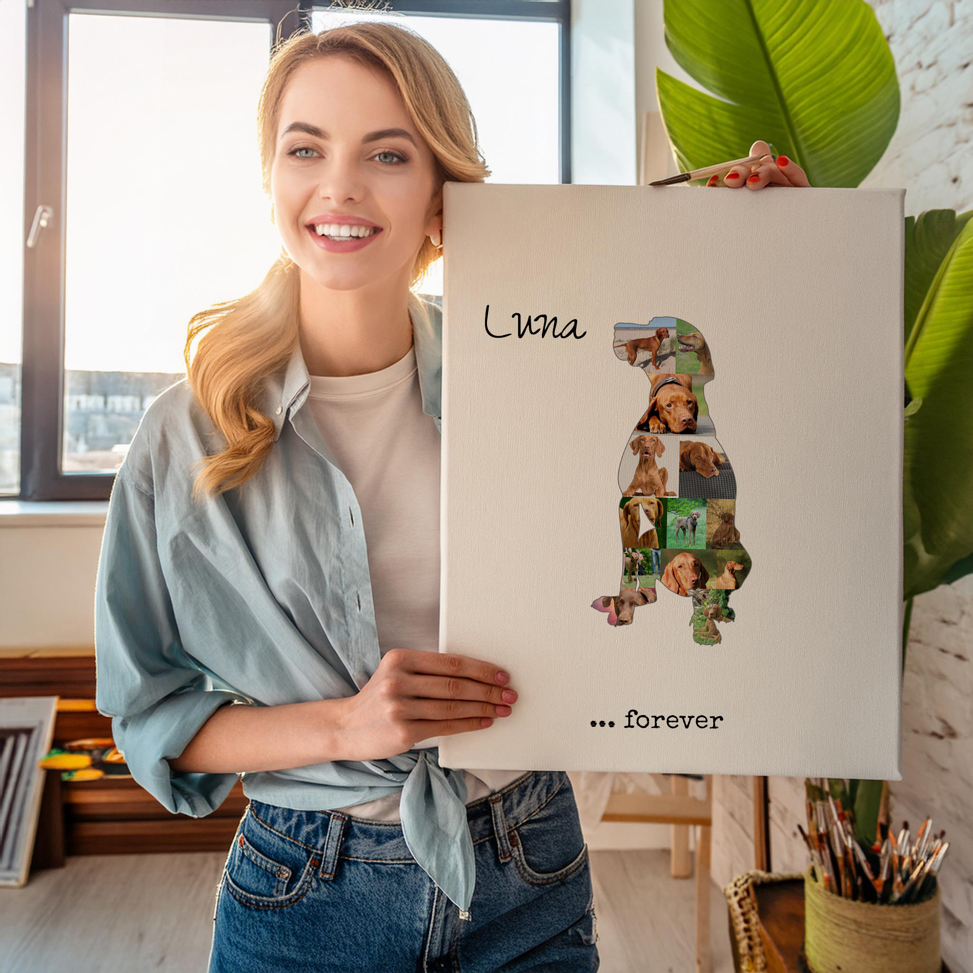 Create a lasting memory of your beloved Vizsla with a personalized photo collage. Designed especially for dog owners, this product features the silhouette of a sitting or standing Magyar Vizsla, filled with 15-20 of your own photos. Add a personal text like forever or love to capture the bond with your furry friend. Perfect as a decorative piece for your home or as a heartwarming gift for fellow dog enthusiasts, you have the freedom to customize photos, silhouette, colors, and text.