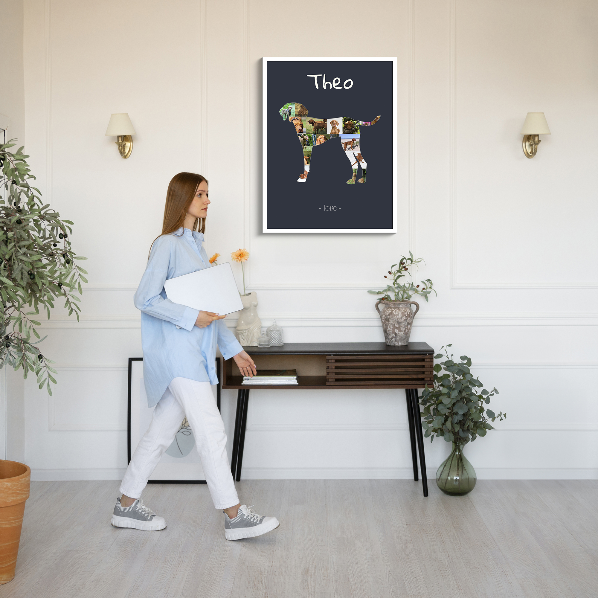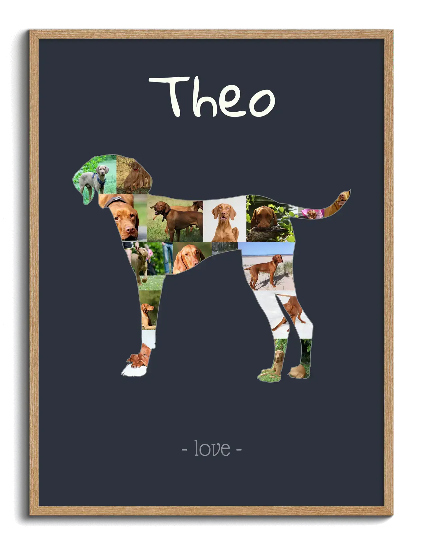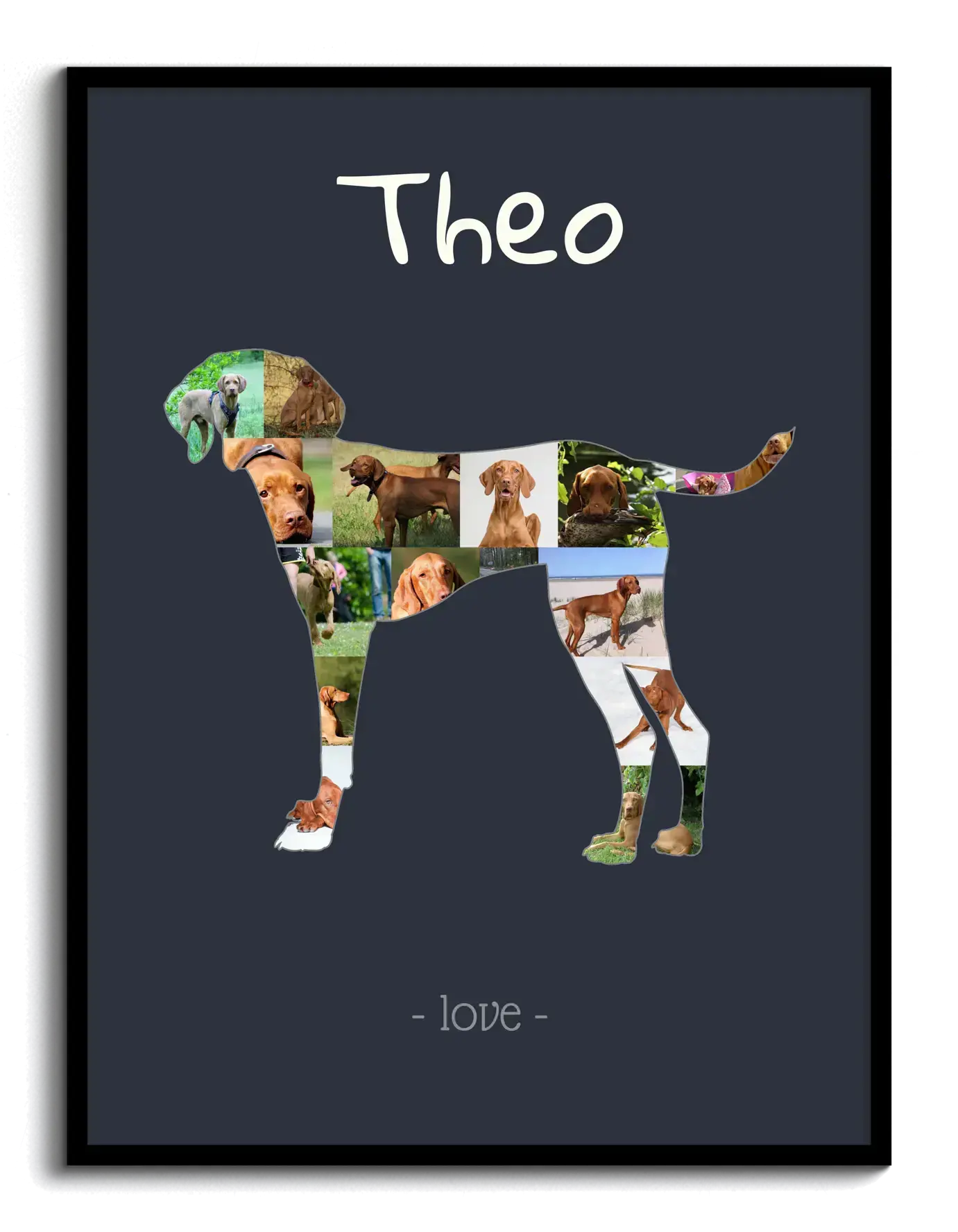 Creating your own Vizsla photo collage is simple. Just choose your preferred design and start customizing. Upload your favorite pictures directly into our web app, arrange them within the silhouette, and add personalized text to make it truly yours. Once you're satisfied with your masterpiece, pick from various print options or download the digital version.
