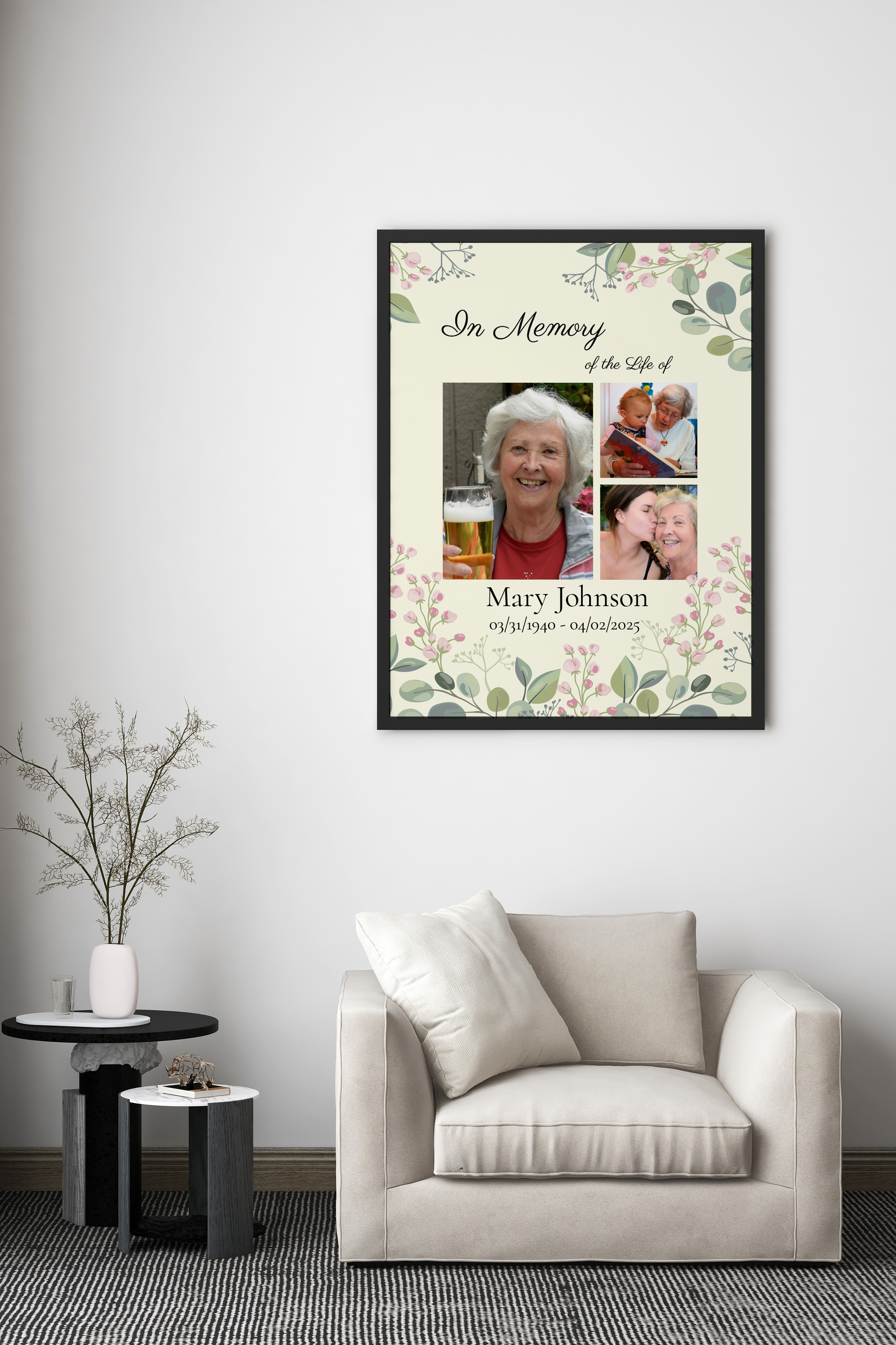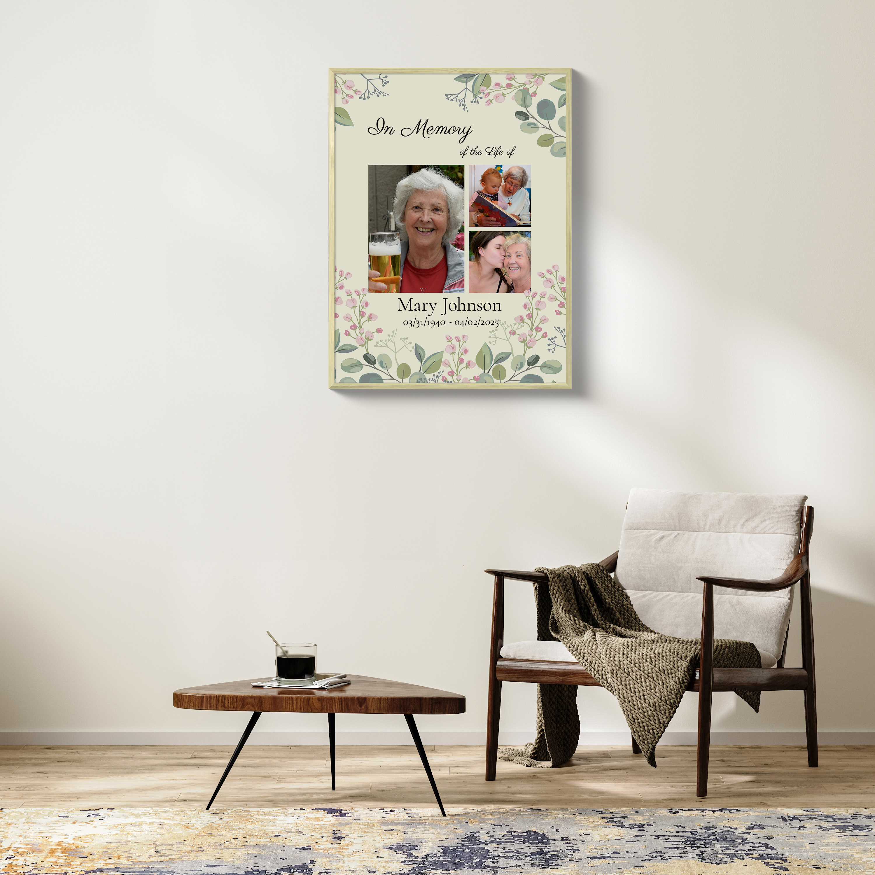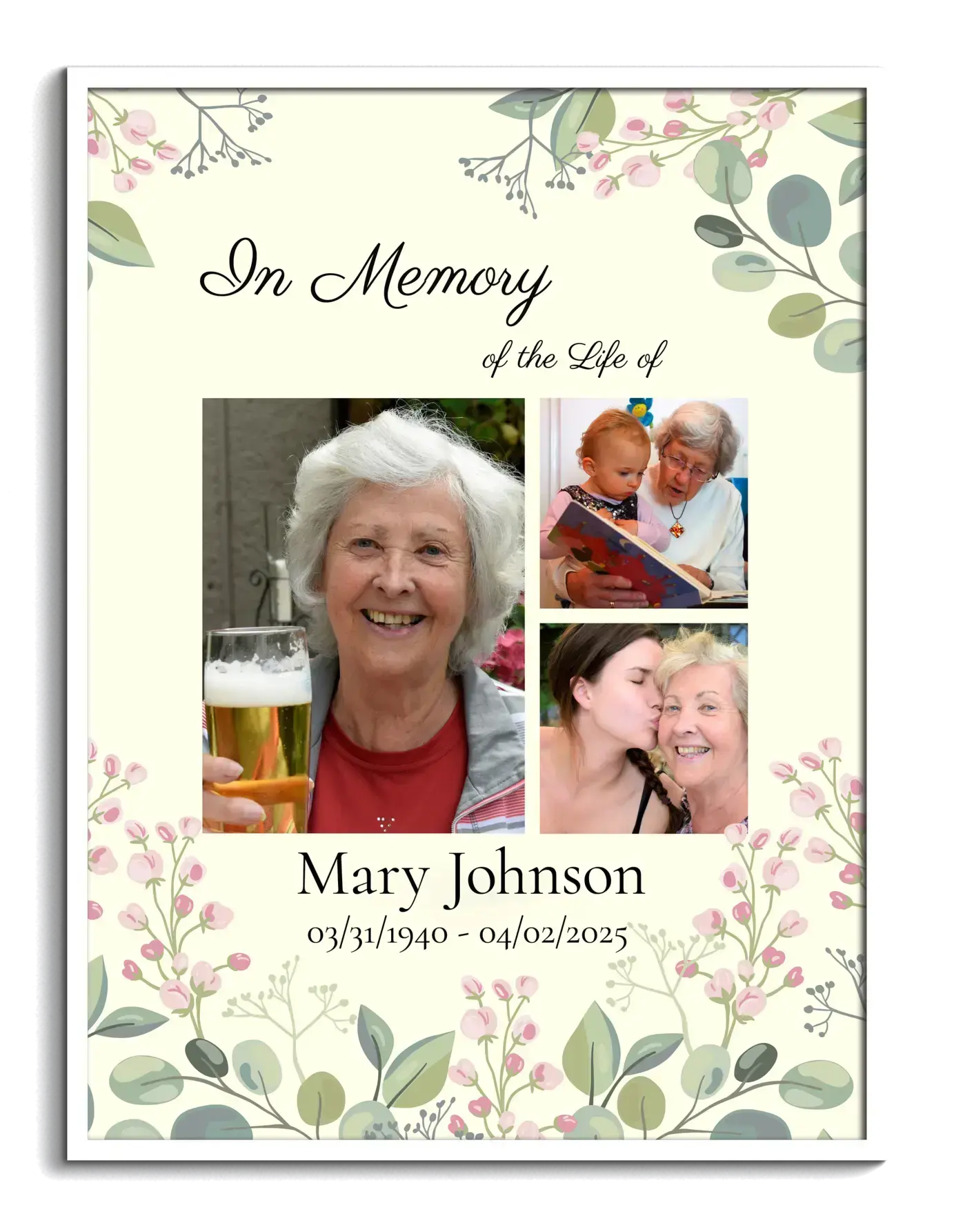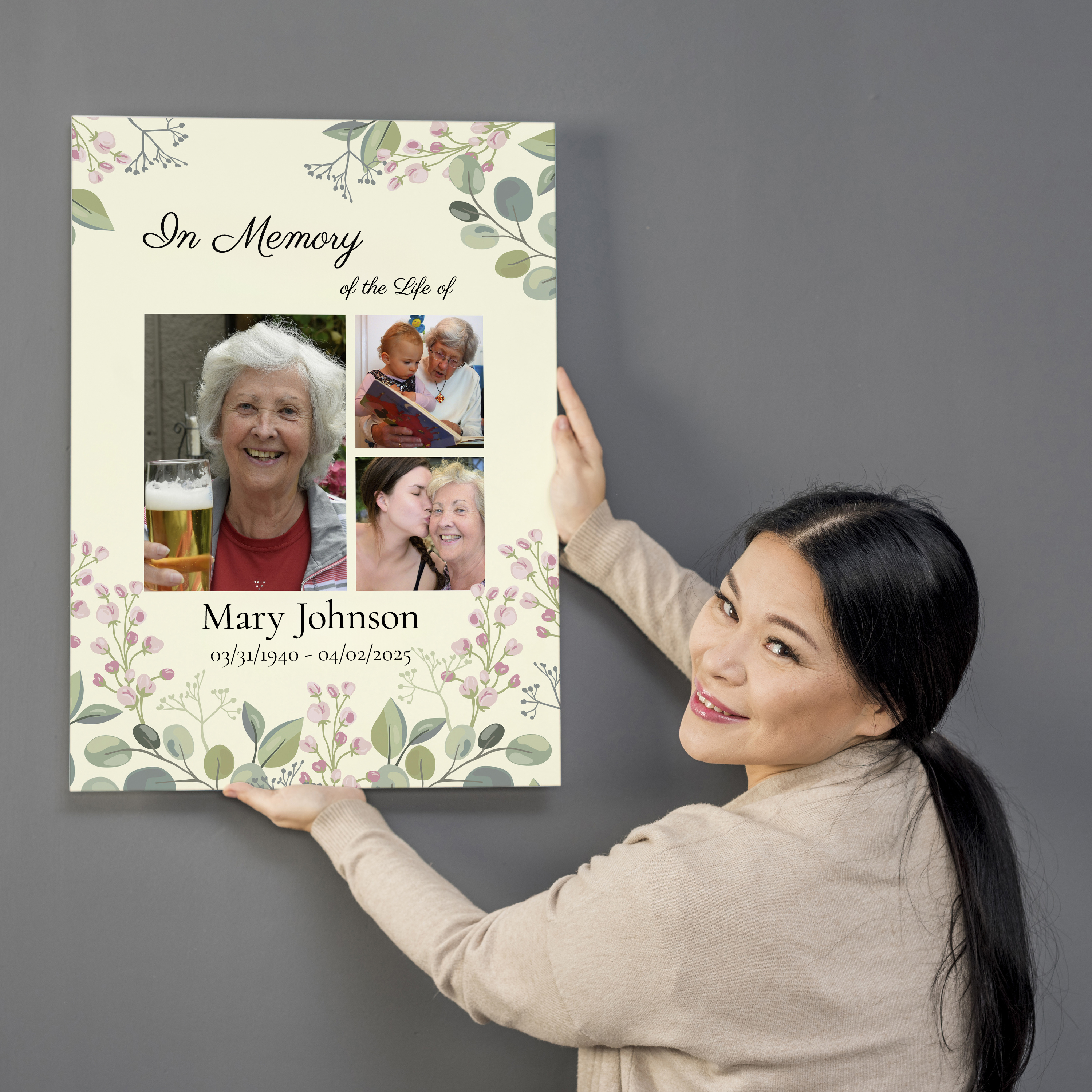 Create a lasting tribute with our customizable memorial collage. This elegant piece serves as a heartfelt keepsake with a subtle floral motif and light green background on a premium canvas. Featuring three tastefully arranged photos and text commemorating a beloved life, it's perfect for honoring a loved one. Personalize with photos, names, dates, and a layout tailored to your preferences, creating a unique memory for any family or friend.