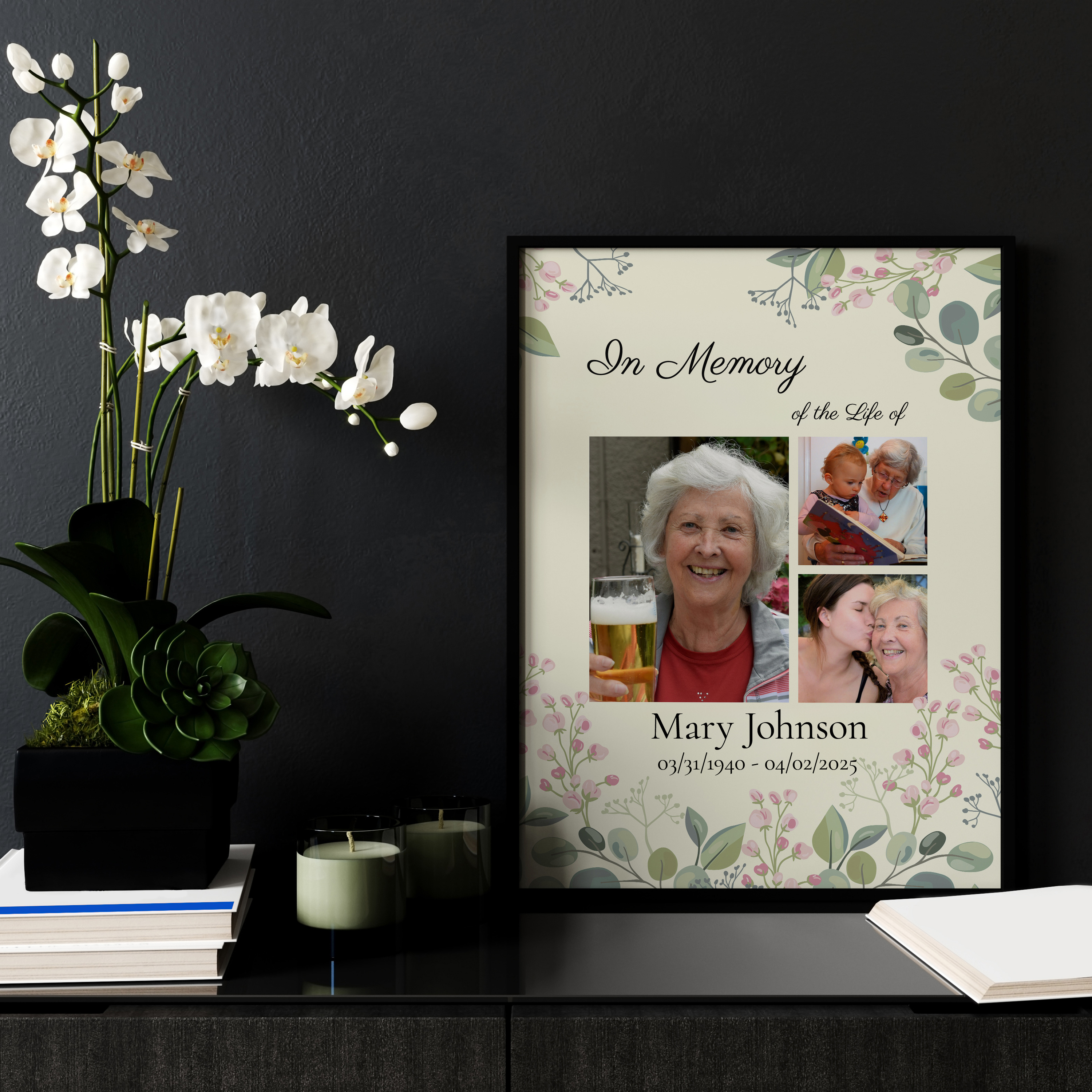 Elegant canvas memorial collage with floral design for cherished memories and personal touches.