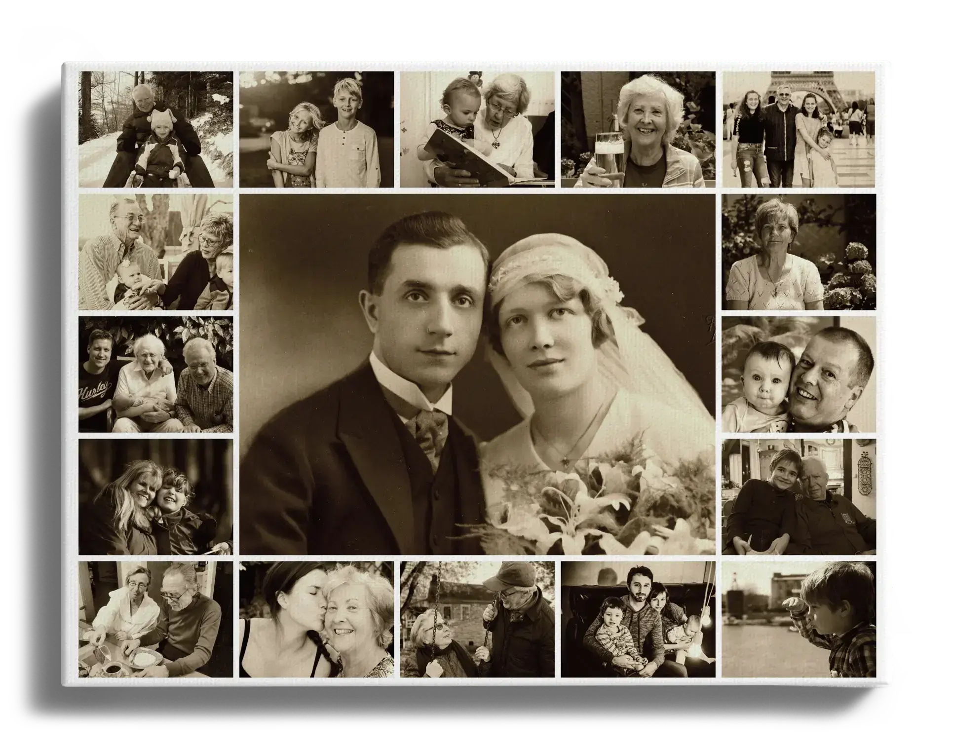 Create a stunning and heartfelt memorial collage with our easy-to-use app. This particular design features a sepia-toned centerpiece photo surrounded by smaller images, elegantly arranged to honor and remember a loved one. It's a perfect keepsake for families and friends or a touching gift to commemorate a special life.