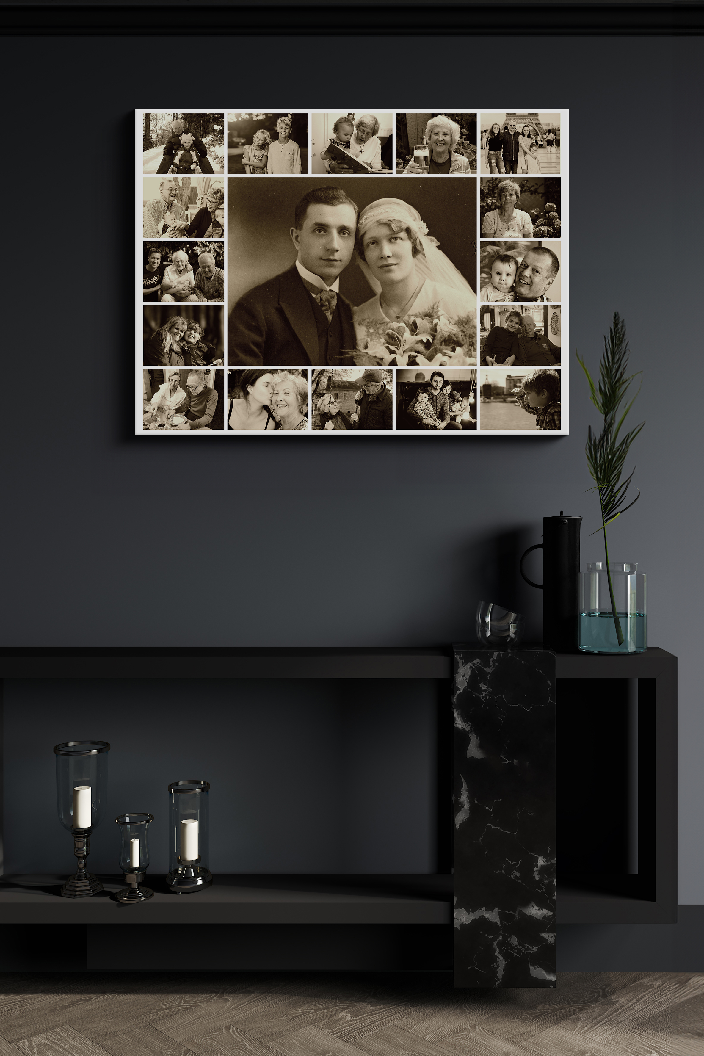 Our collages are available in a range of premium materials. Opt for a classic poster with a silk-matte finish and UV protection, or add a sophisticated touch with a framed poster available in black, white, natural wood, or dark brown. For a more artistic look, choose a canvas with a sturdy 2 cm wooden frame, or go modern with an Alu-Dibond or an acrylic option. Prefer a digital copy? Download a high-resolution file to print at your convenience.