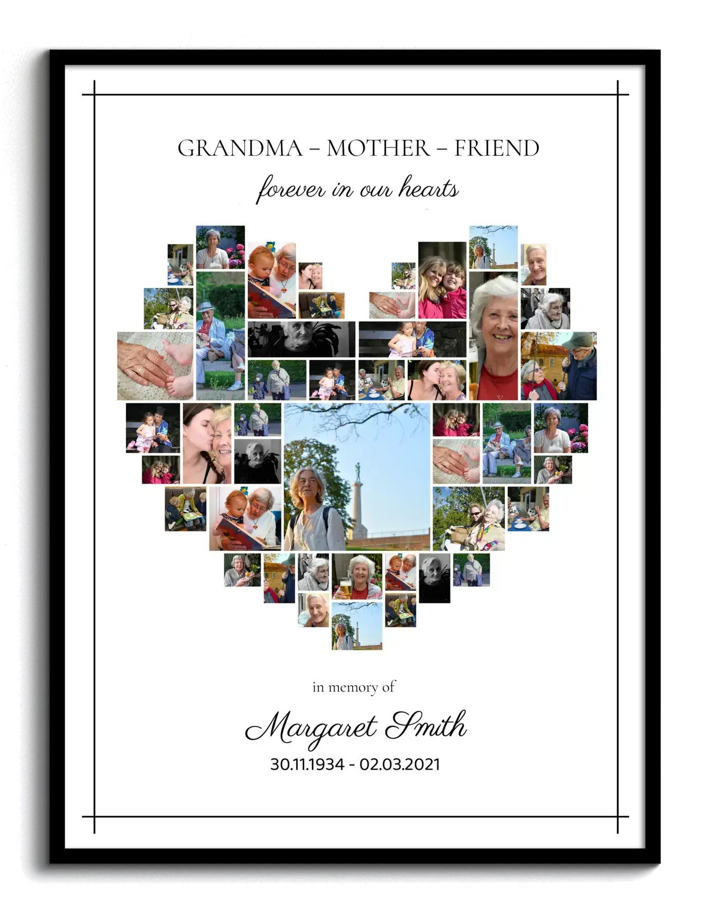 Create a personalized tribute collage in heart shape to honor a cherished loved one. Featuring multiple photos forming a heart with a central image in the middle, this design includes the text "Grandma, Mother, Friend – forever in our hearts" above, and "In memory of" followed by the name and birth and death dates below the collage. Elegantly simple and respectful, photos, text, and layout can be custom tailored. Ideal for display at memorial services or funerals, as a lasting home remembrance, or as a heartfelt gift for family members.