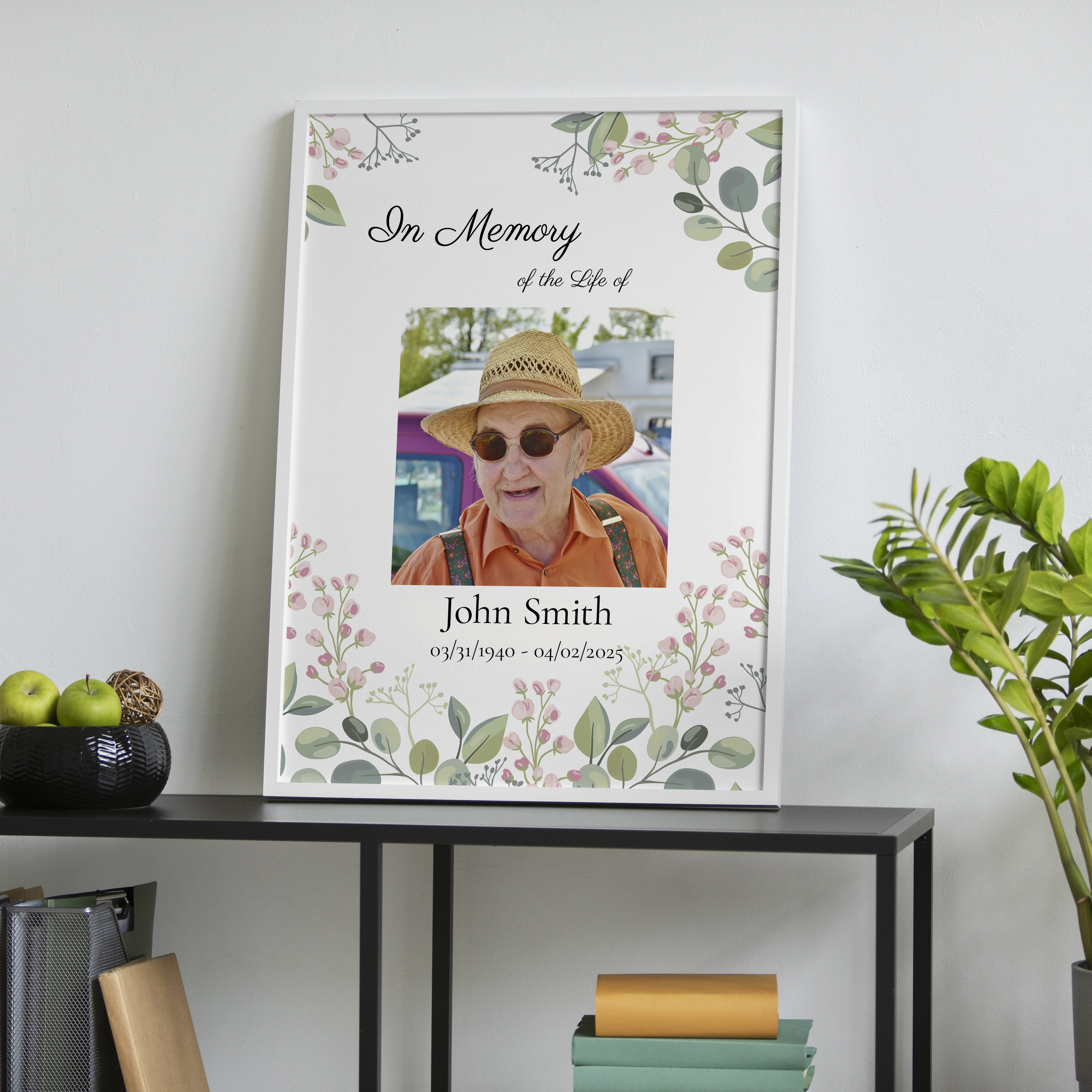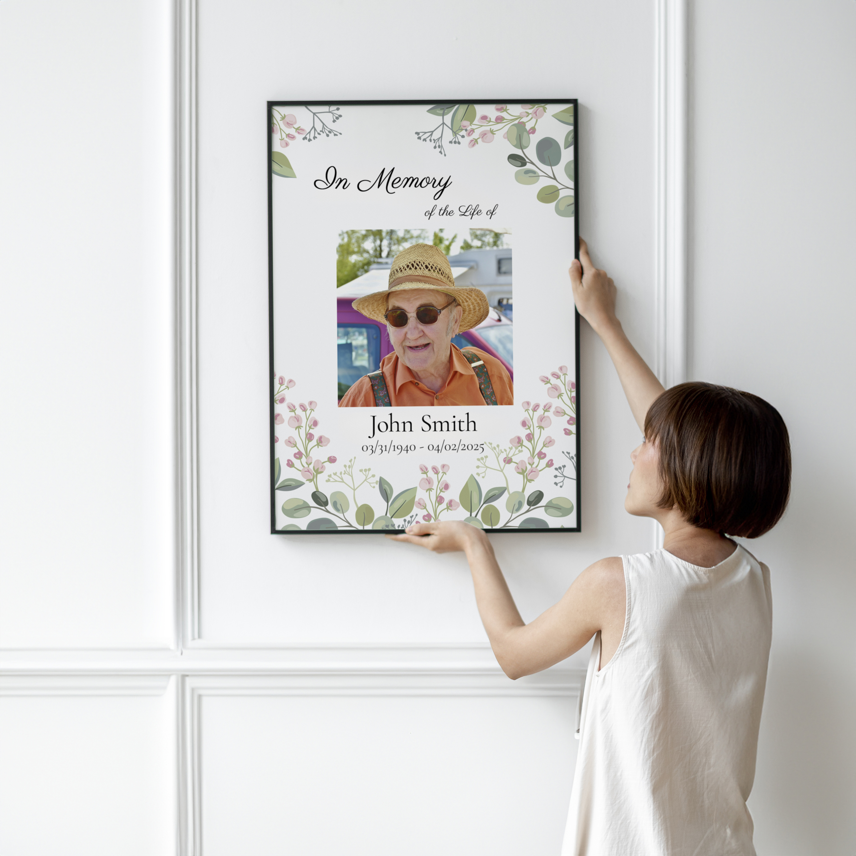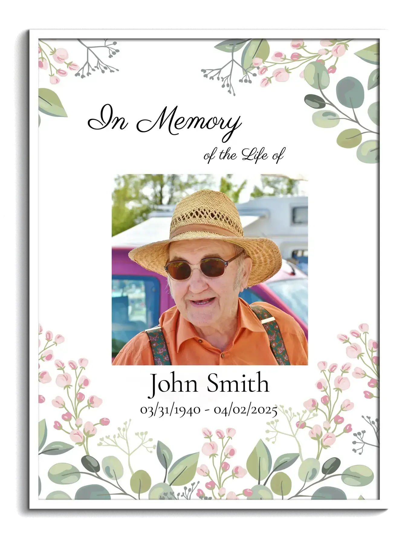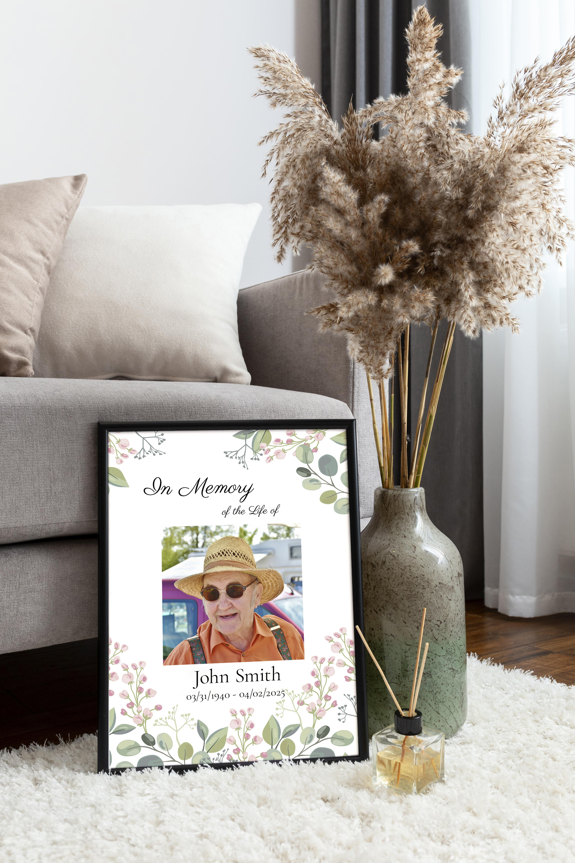 Elegant memorial photo on floral background, customizable for a cherished tribute.