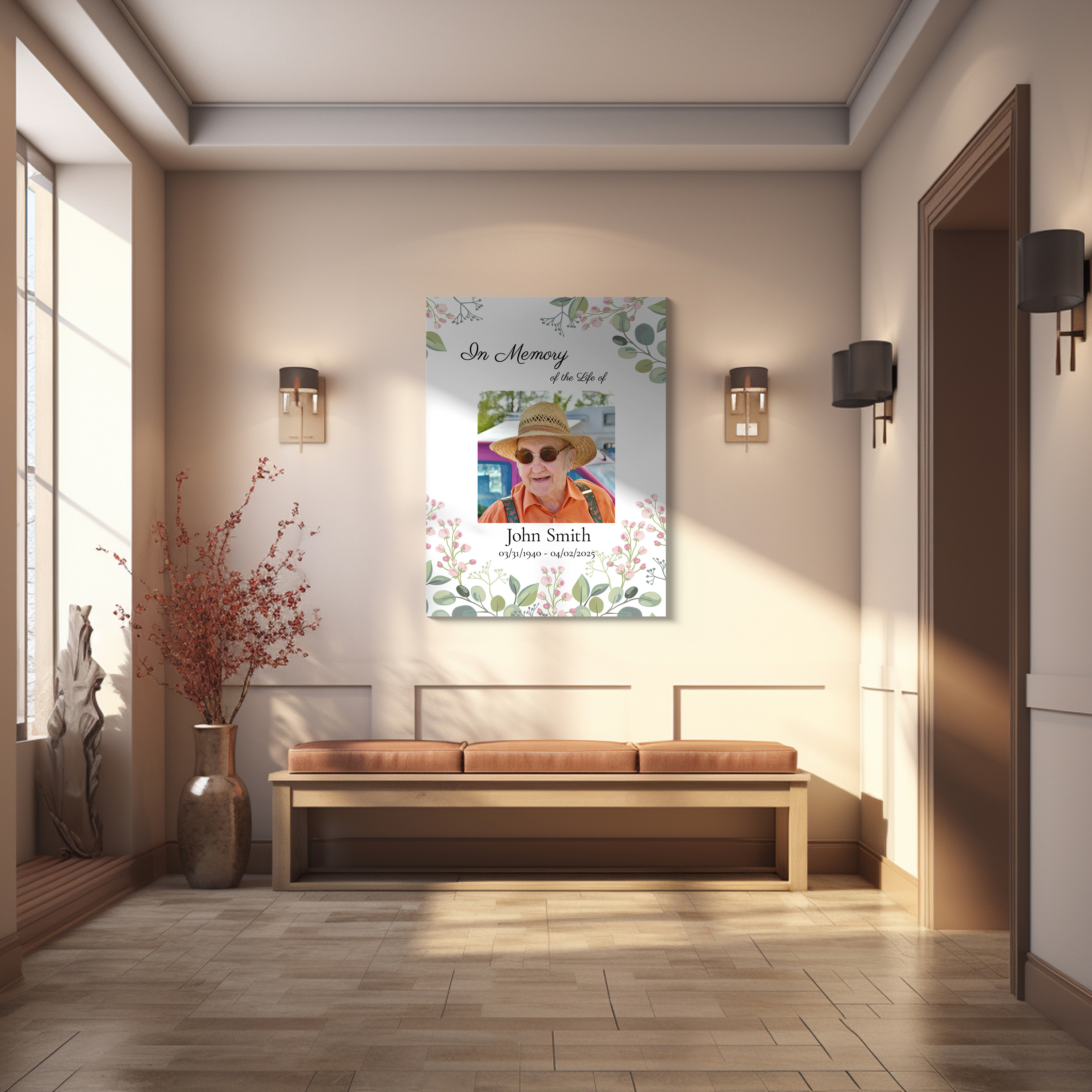 Create a cherished memory to honor your loved ones with our customizable memorial photo collage. This elegant design features a single portrait of the beloved individual set against a subtle floral background, with the touching inscription: "In Loving Memory of...," accompanied by their name, birth, and passing dates. Perfect for adding a personal touch to a memorial service or as a heartfelt keepsake for the home, this collage allows you to adjust the portrait, text, font, name, dates, and layout to your preference. Order it as a poster, framed print, canvas, acrylic, Alu-Dibond, or download.