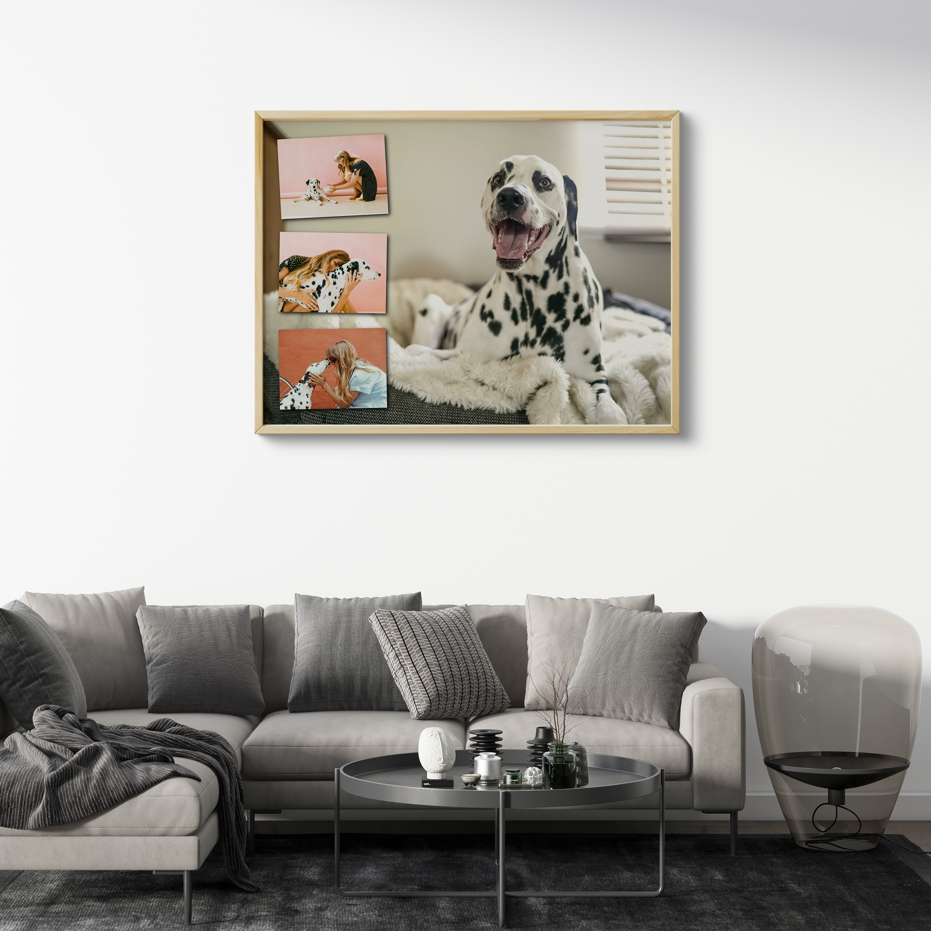 Create your own personalized photo collage with just a few clicks! Imagine having a custom collage on Alu-Dibond in an impressive XXL format, like a cherished memory of your beloved dog. Picture a large background image of the dog, seamlessly accompanied by three smaller photos elegantly arranged on the left. This makes for a stylish keepsake or a stunning focal point for your home. And the best part? Every aspect of it, from photos to layout, can be tailored to your liking.