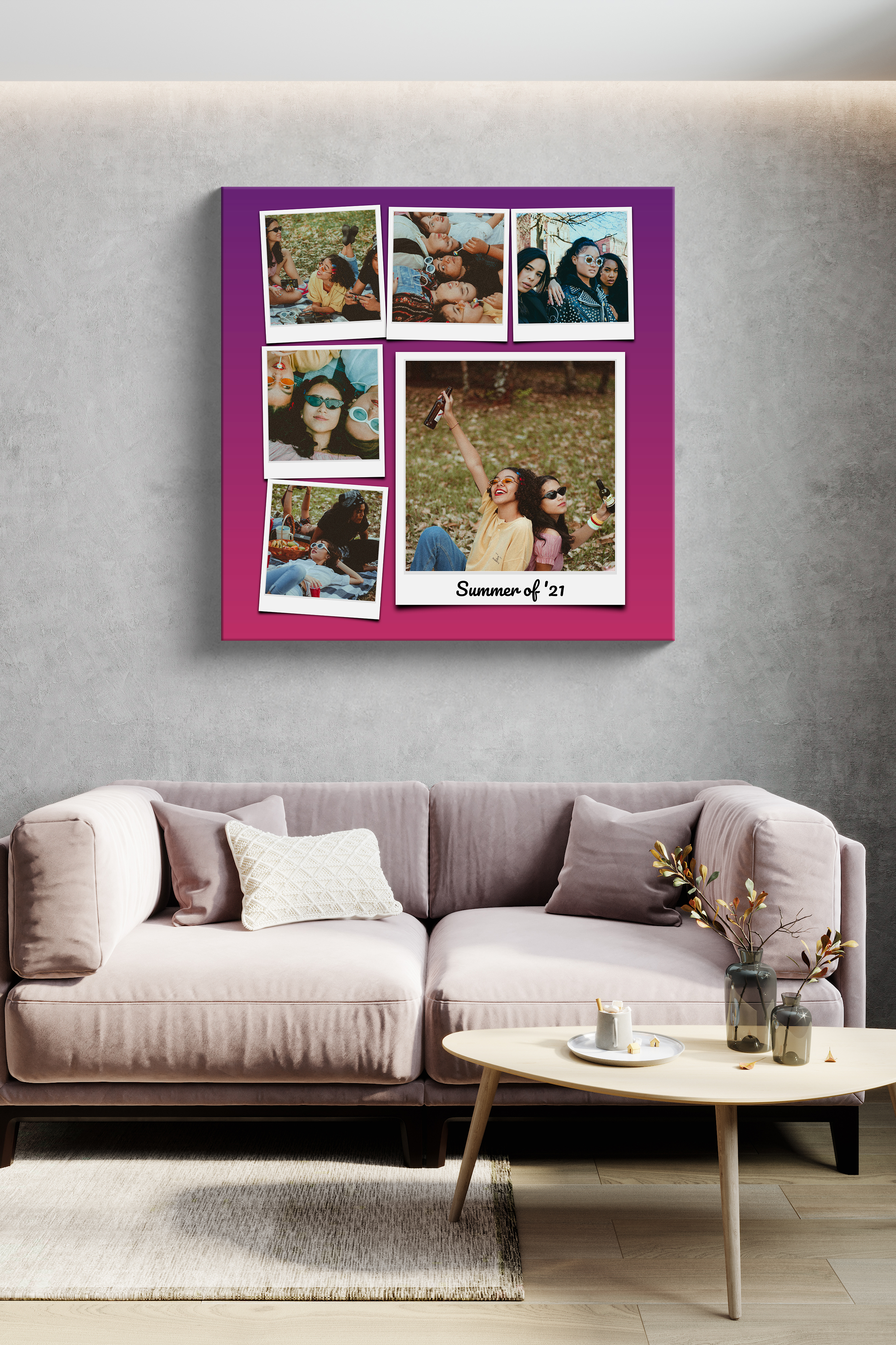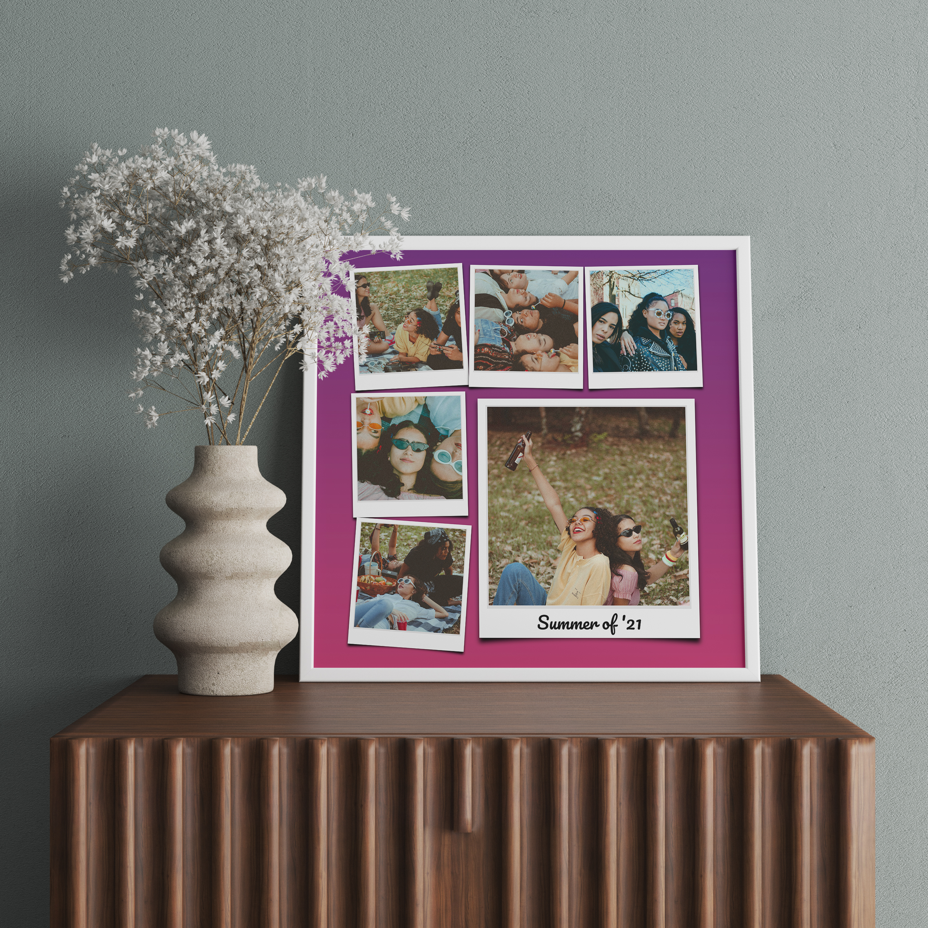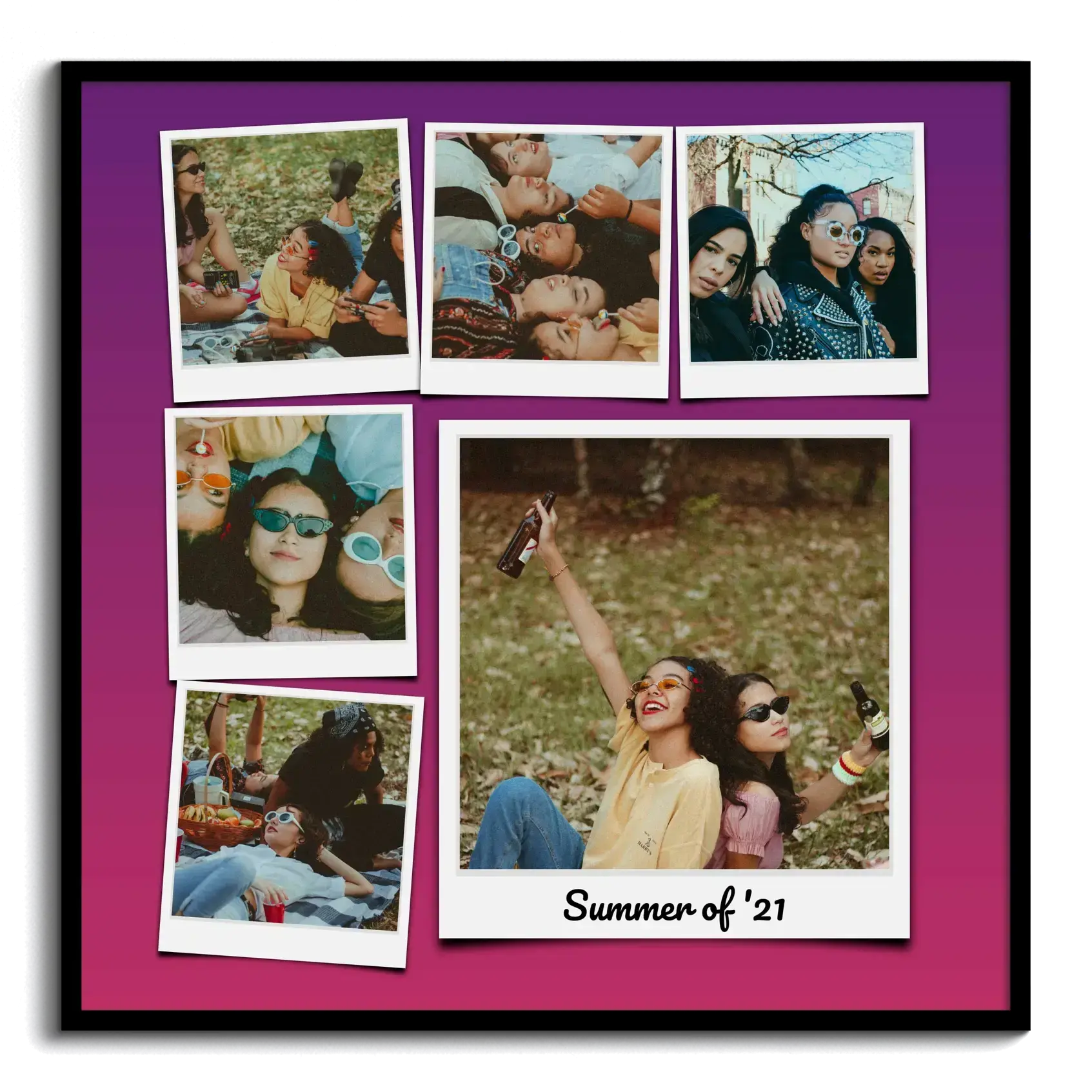 Create your own playful photo collage in a retro Polaroid design, perfect for capturing and displaying your favorite moments with friends, family, or loved ones. This vibrant collage features customizable captions and a bold gradient background, making it a unique keepsake for commemorating special memories. Let your creativity flow as you personalize everything from the number of photos to the text and backgrounds.