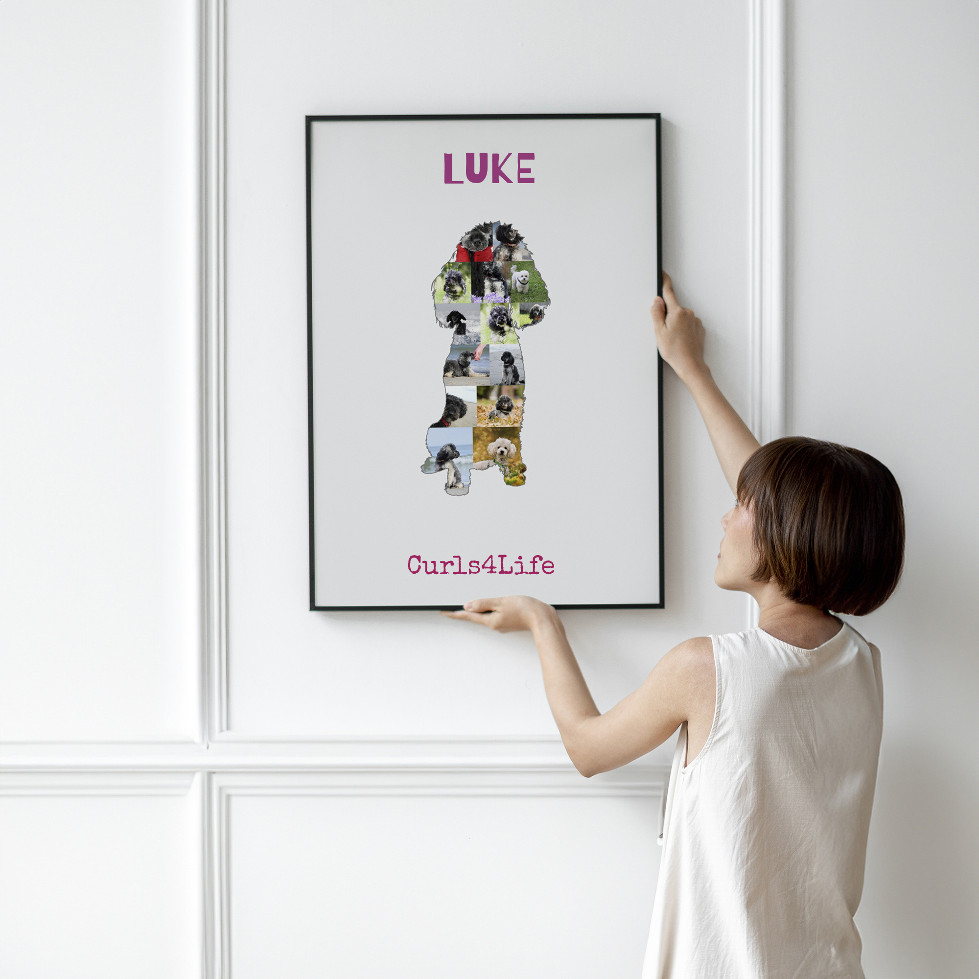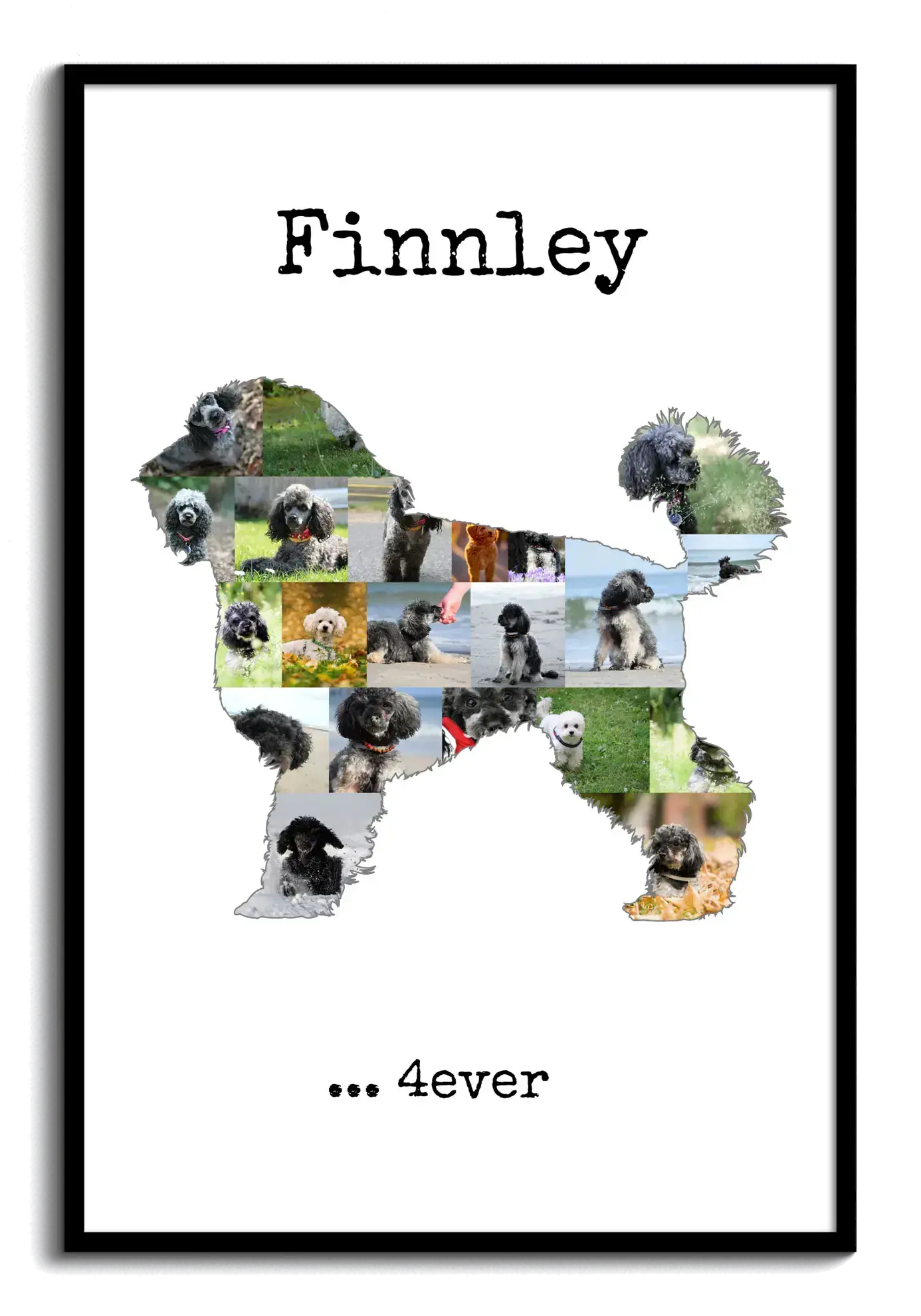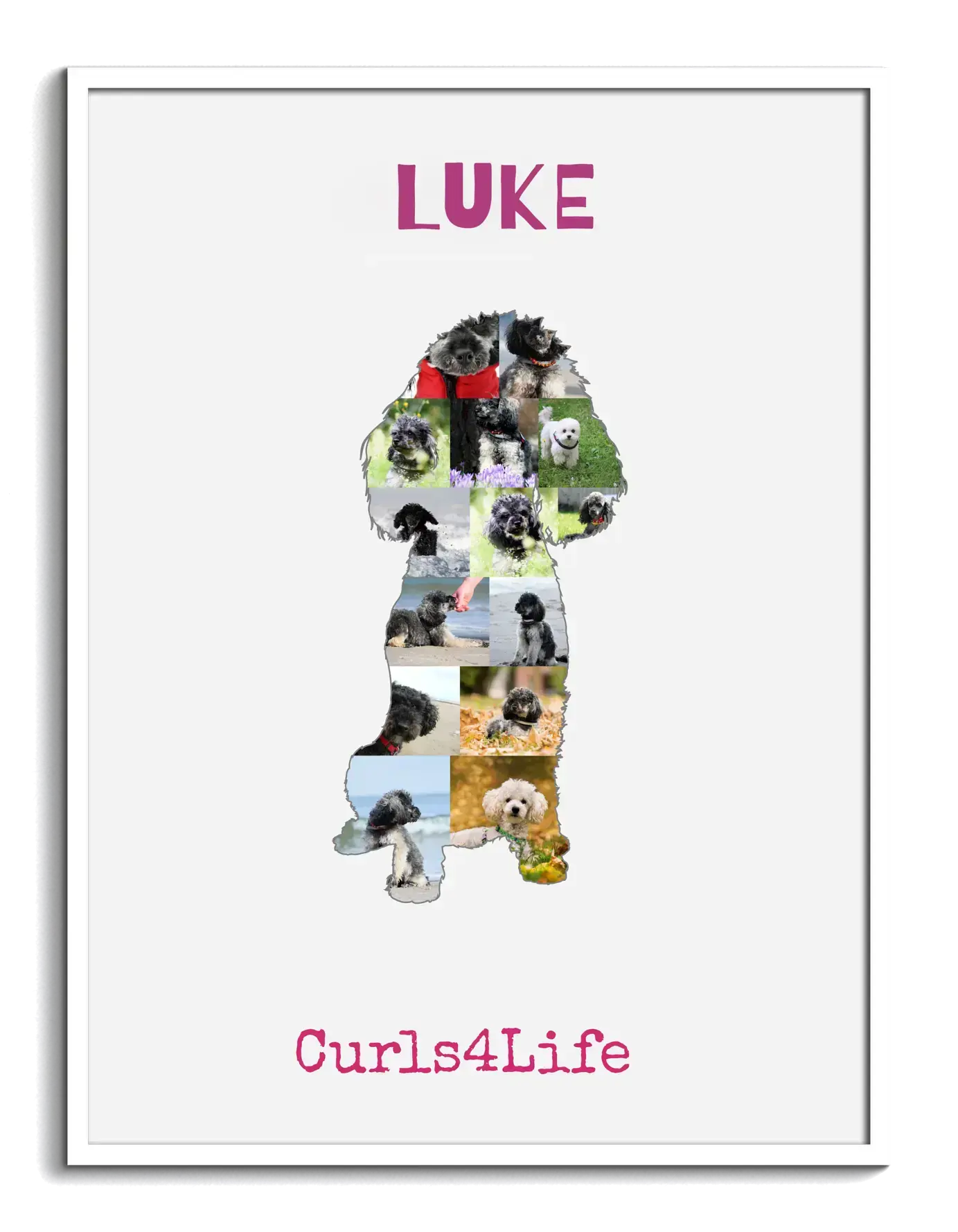 Create a charming keepsake of your beloved toy miniature poodle with our customizable photo collage! Designed specifically for dog lovers, this unique collage features the silhouette of a sitting or standing toy miniature poodle, artfully filled with 15-20 of your own cherished photos. Add a personal touch with custom text like "4ever" or "Curls4Life." This is a perfect way to celebrate your furry friend, either as a delightful home decoration or a thoughtful gift for family and friends. Customize the photos, silhouette, colors, and text to make it truly yours.