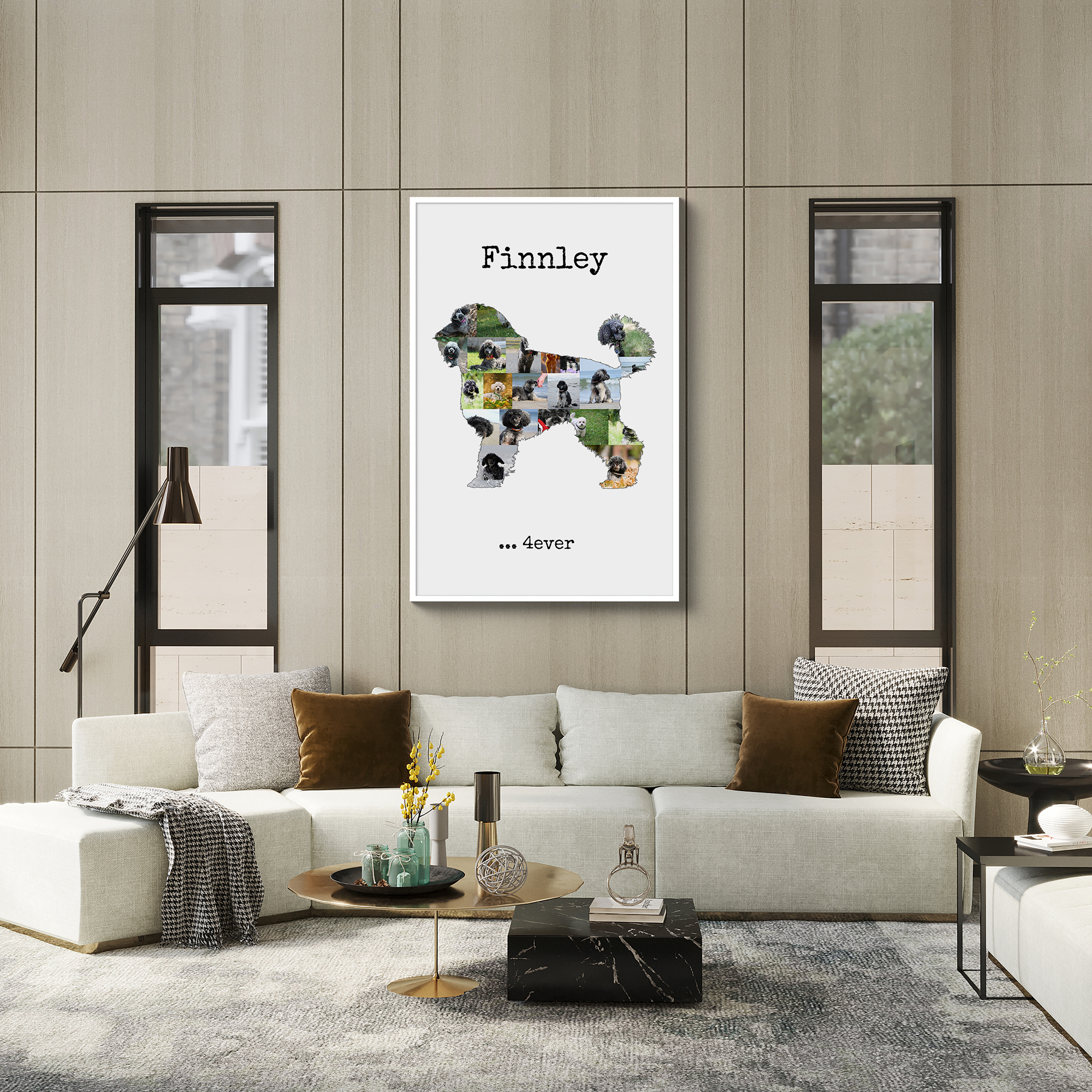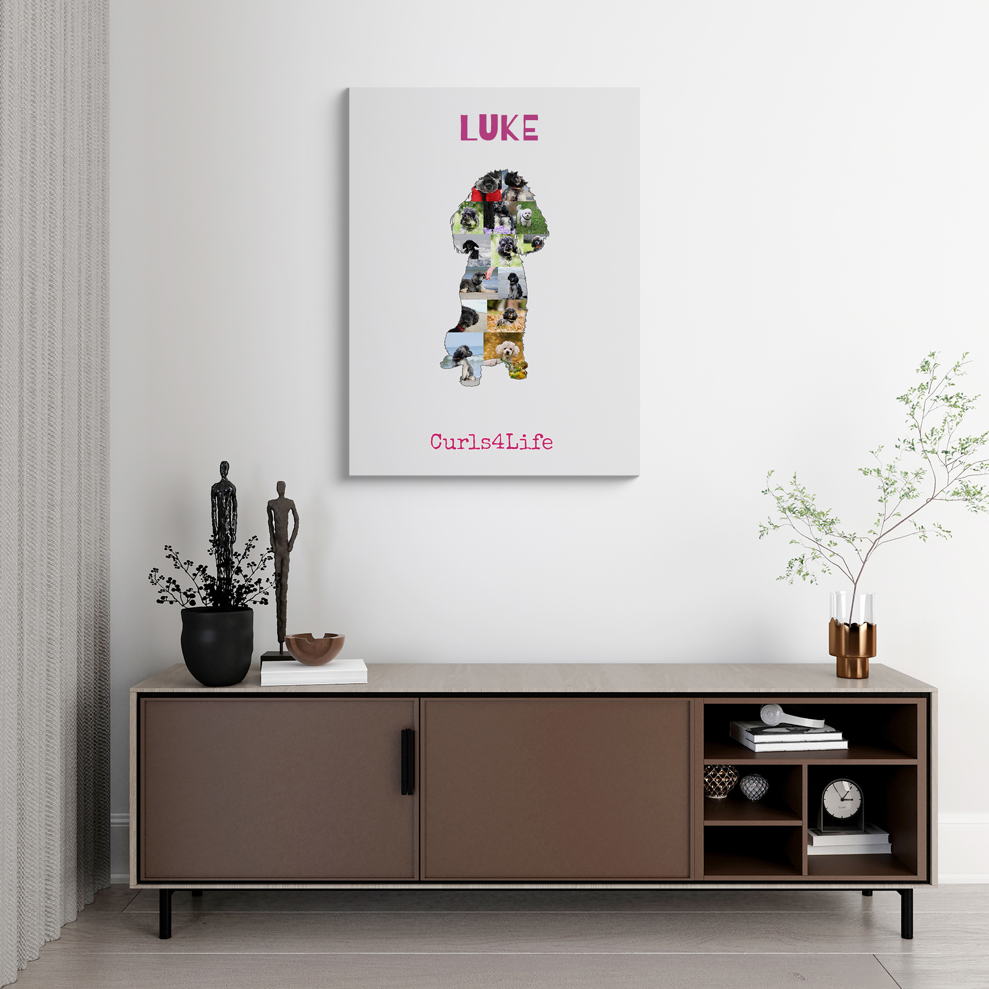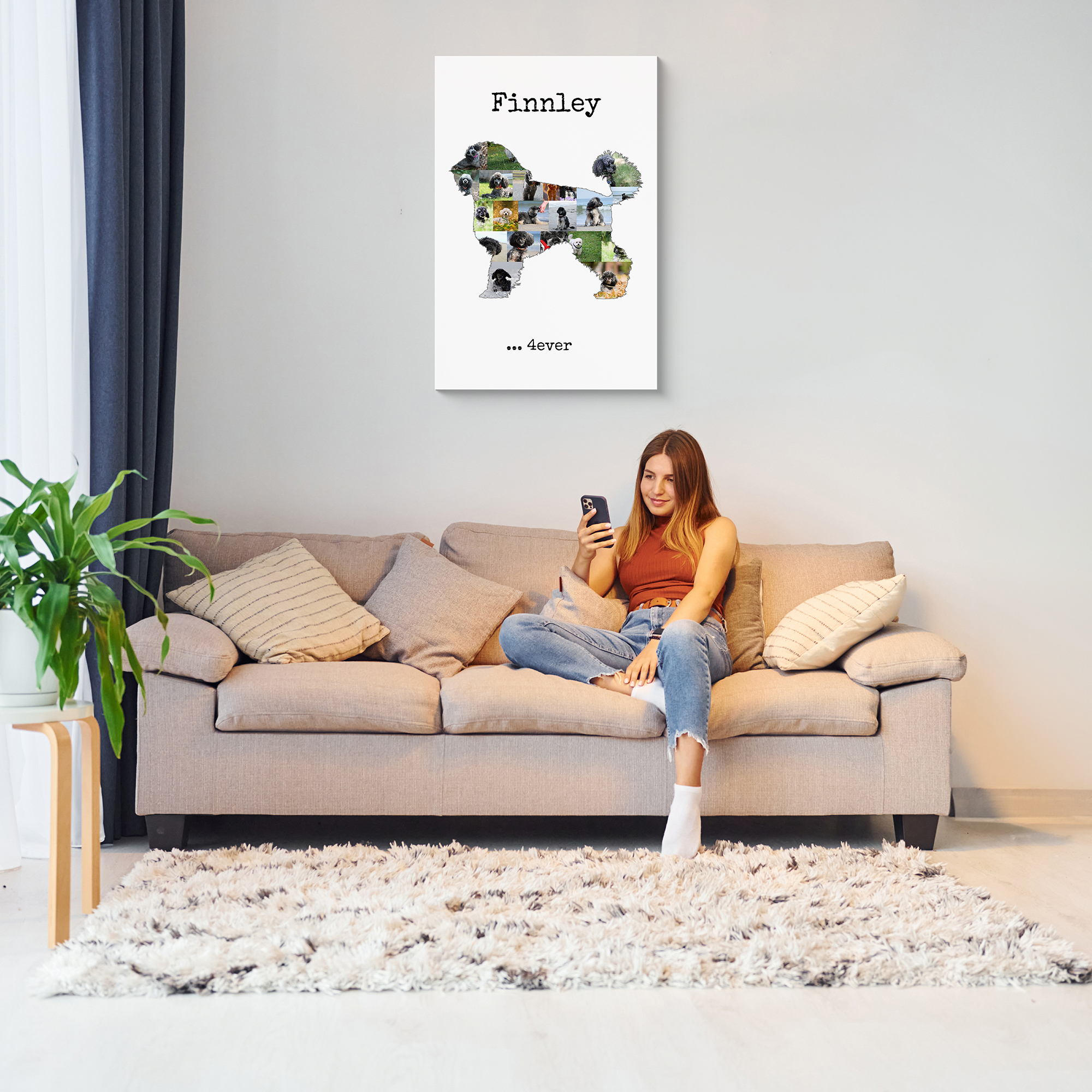 Create a charming keepsake of your beloved toy miniature poodle with our customizable photo collage! Designed specifically for dog lovers, this unique collage features the silhouette of a sitting or standing toy miniature poodle, artfully filled with 15-20 of your own cherished photos. Add a personal touch with custom text like "4ever" or "Curls4Life." This is a perfect way to celebrate your furry friend, either as a delightful home decoration or a thoughtful gift for family and friends. Customize the photos, silhouette, colors, and text to make it truly yours.