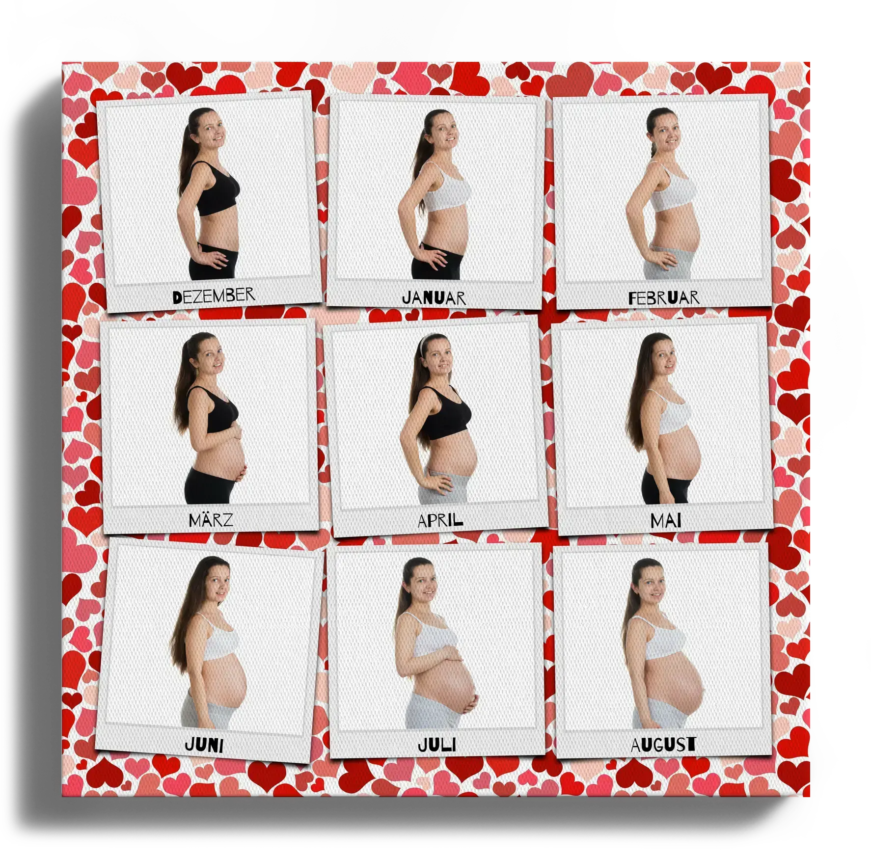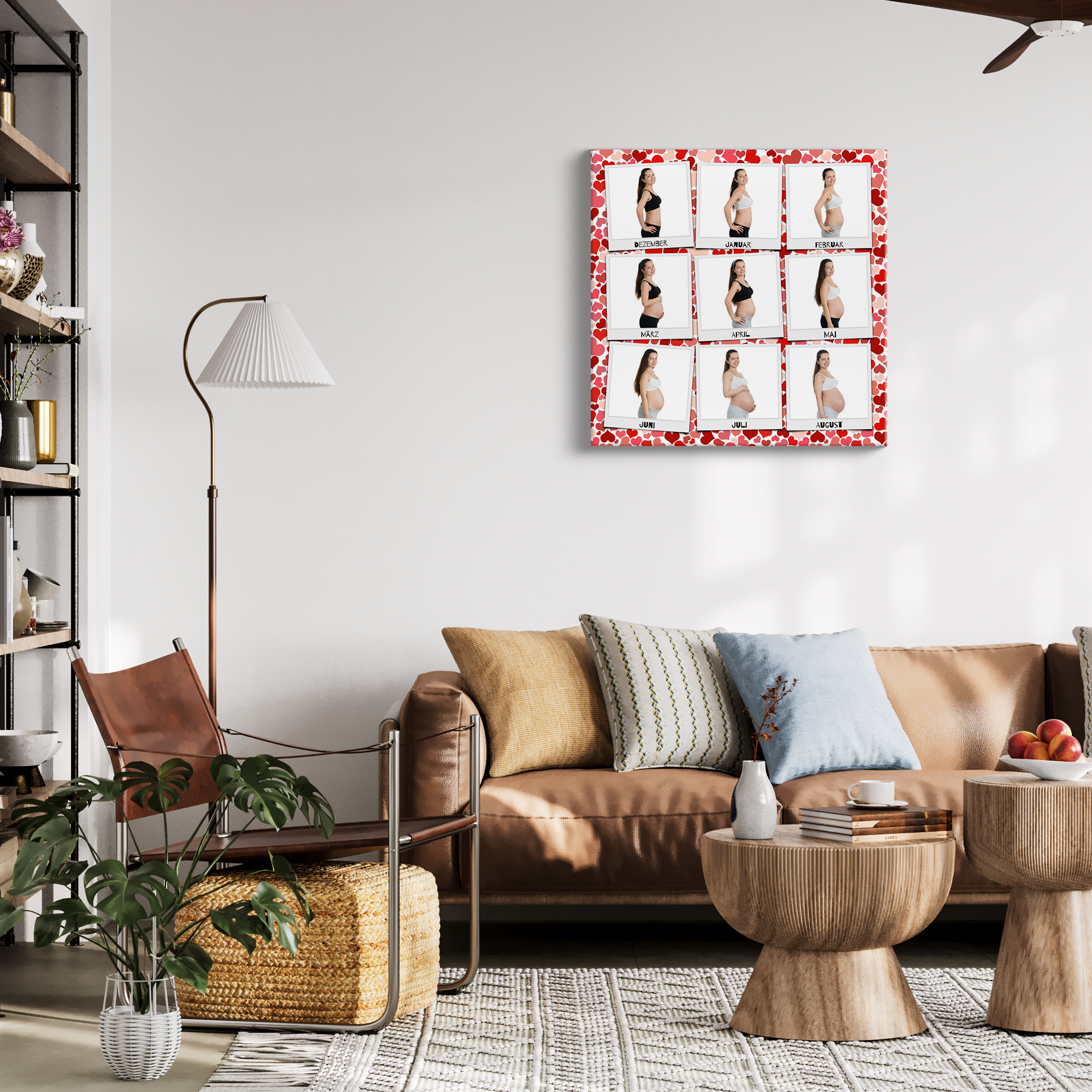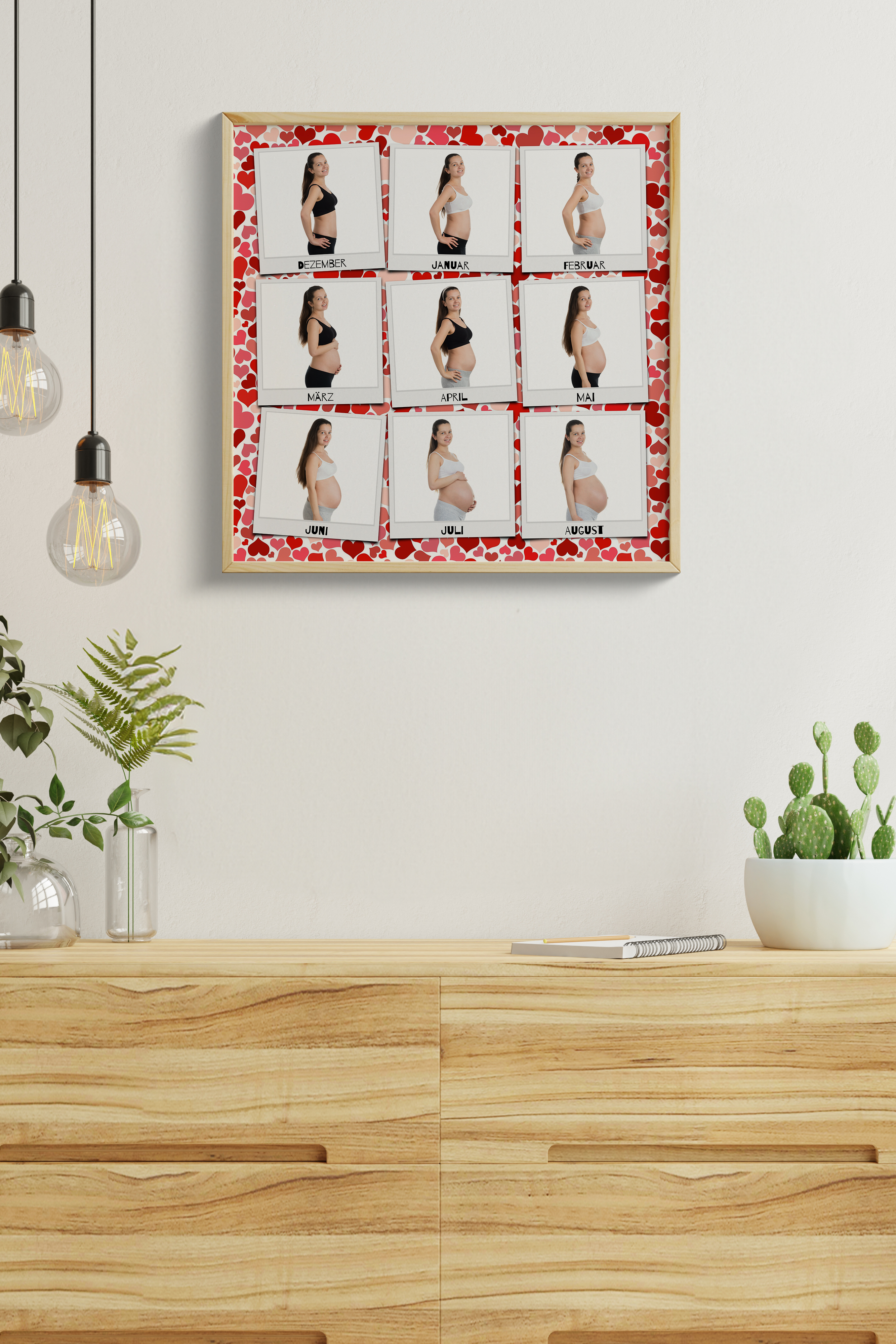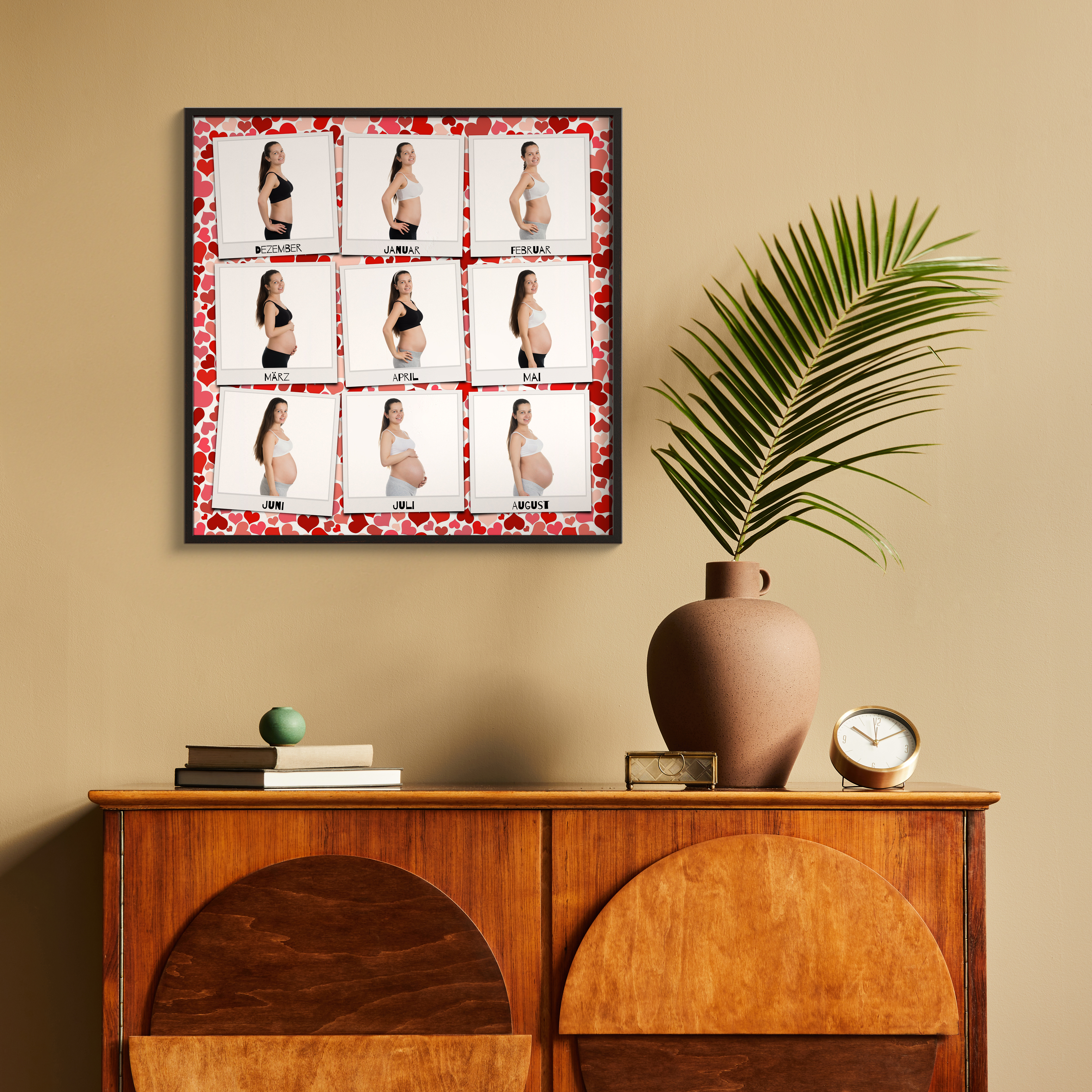 Create your own personalized pregnancy belly photo collage in a charming Polaroid style. This unique piece features nine Polaroid-style photos, each capturing a monthly memory of your pregnancy beautifully labeled with the respective month. Customize this collage with your own photos and text, making it a memorable decoration or a cherished gift for expecting parents.