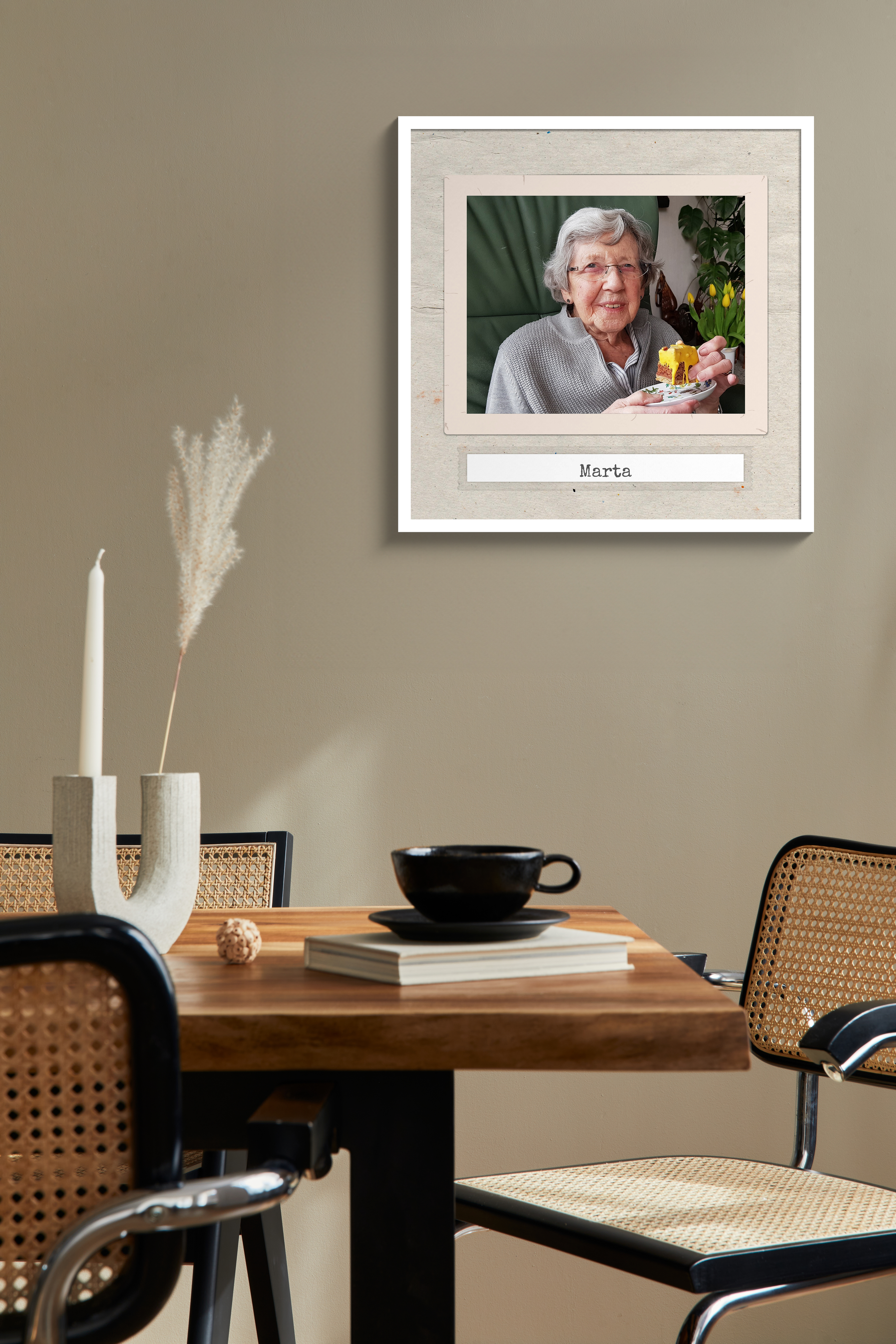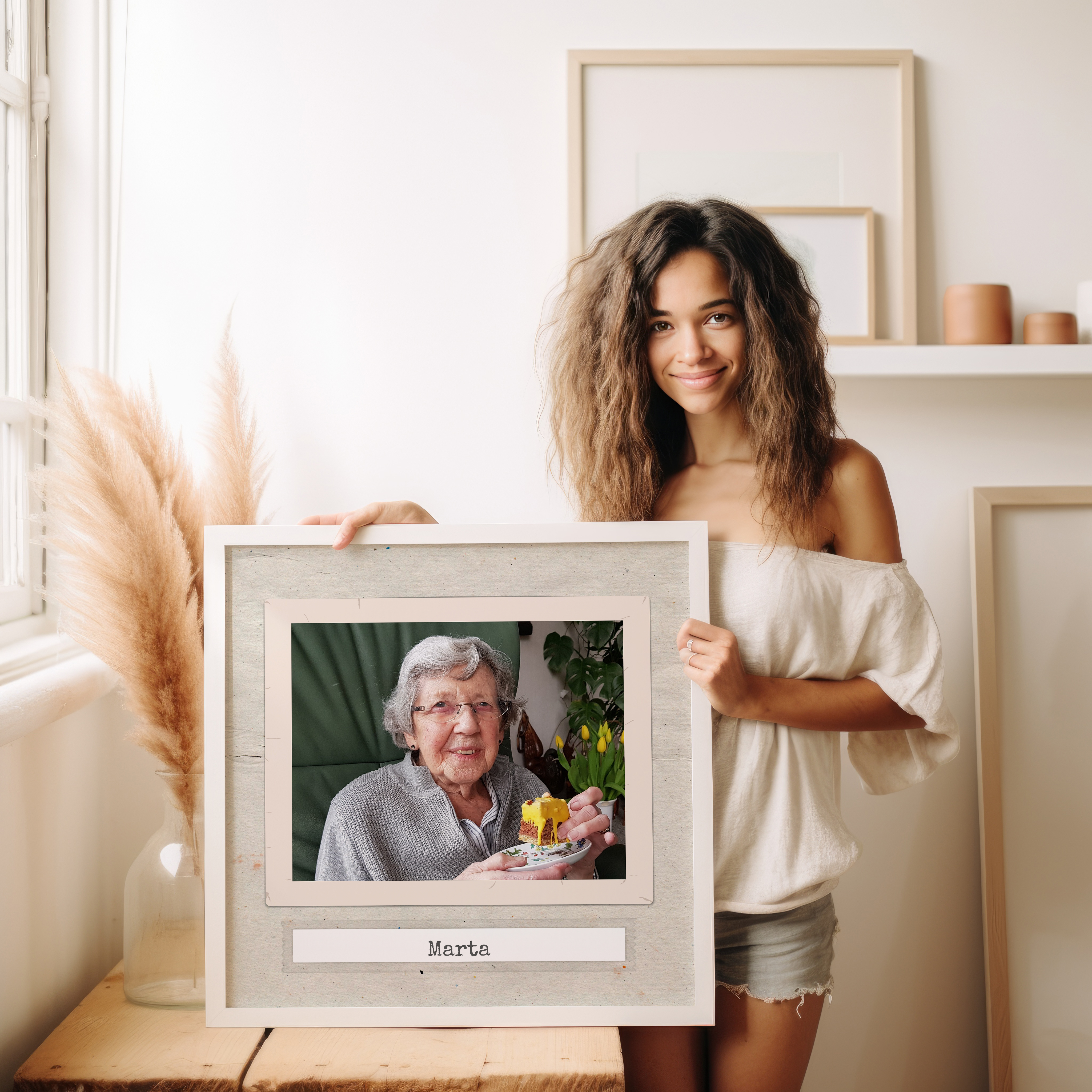 Create a timeless memory with your own personalized photo collage. This example features a single, retro-style mourning photo with a beige border, designed for a memorial service. It showcases a portrait of your beloved, complete with a name design, such as Marta, offering a touching tribute. Ideal for families and friends who want a stylish keepsake or a photographic centerpiece for a remembrance ceremony. Both the portrait and the name are customizable to best honor your loved one.